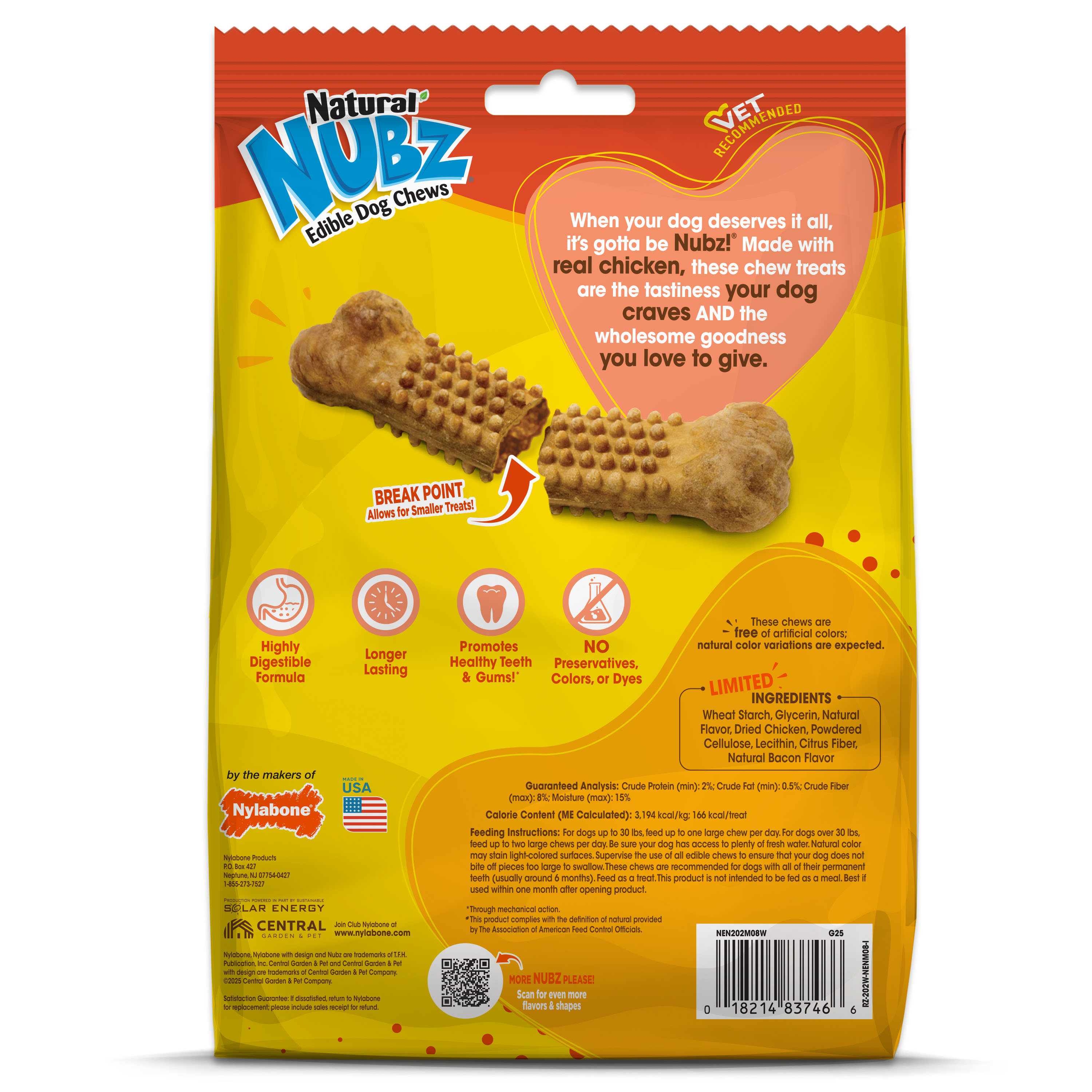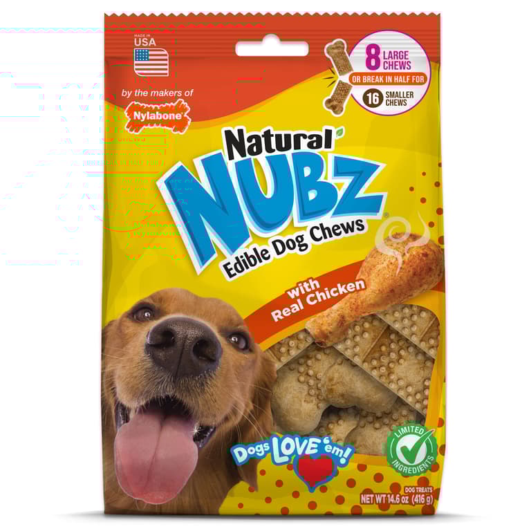 Highly digestible chew treats made with natural chicken flavor dogs love; Made with natural ingredients -contains no artificial colors, flavors or preservatives; Nubz helps prevent plaque and tartar buildup for healthy teeth & gums; Proudly Made in USA
