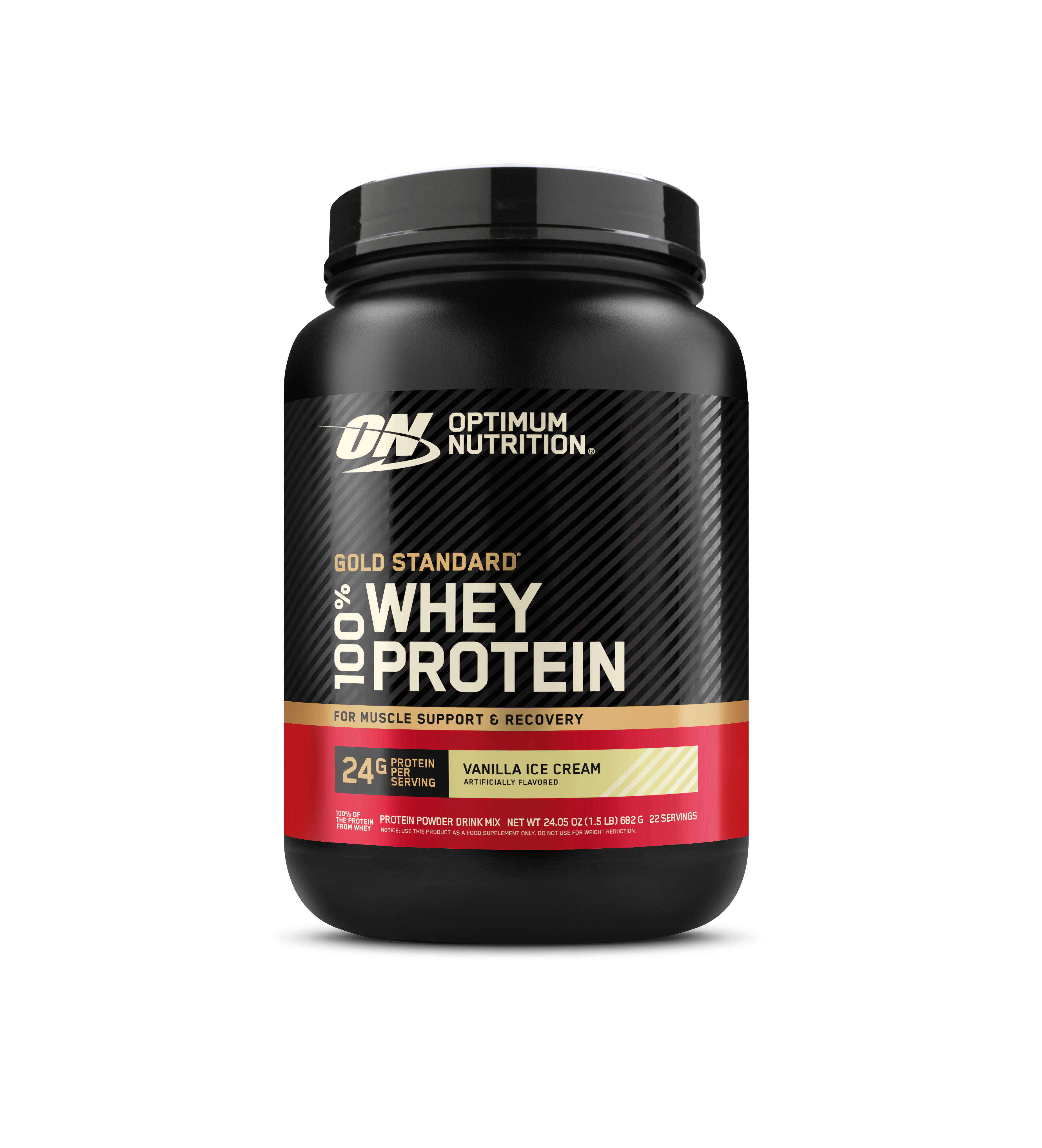 New look, with the same trusted qualityOPTIMUM NUTRITION'S GOLD STANDARD 100% Whey uses pure Whey Protein Isolates as the primary ingredient. Combined with ultra-filtered whey protein concentrate, each serving provides 24 grams of all-whey protein and 5.5 grams of naturally occurring Branched Chain Amino Acids BCAAs which are prized by athletes for their muscle building qualities.GOLD STANDARD 100% WHEY BLEND - 24g blended protein consisting of whey protein isolate, whey protein concentrate, and whey peptides to support lean muscle mass - they don't call it the GOLD STANDARD of quality for nothingOVER 5G OF BCAAS - help build lean and strong muscles with naturally occurring BCAAsOver 5 grams of BCAAS help build lean and strong muscles with BCAAs. 3-4 grams carbs, 1-3 grams sugar, and 1-1.5 grams fat, gluten free, no sucralose in Vanilla Ice Cream flavor. Notice: Do not use as a sole source of nutritionINSTANTIZED - improves mixability to prevent lumps and clumpsBANNED SUBSTANCE TESTED - highest quality control measures so you feel comfortable and safe consuming the productSpecifications