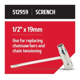 All metal design combines a wrench and screwdriver to make an all-in-one tool; Ideal for replacing chainsaw bars and chain tensioning; Long body provides more leverage while working; Wrench size 1/2 13mm x 19mm