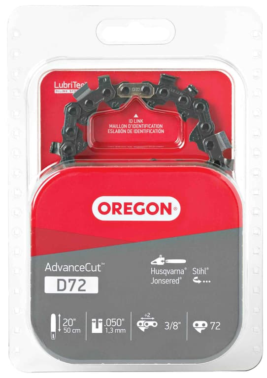 The Oregon AdvanceCut 20-Inch Chainsaw Chain is a low kickback chain that is ideal for occasional and commercial chainsaw users. The low-vibration full chisel cutters offer top performance while also providing a smooth cutting experience via our patented bent over depth gauge. The low-vibration design gives you greater control of the saw, reducing fatigue and kickback. This .050" gauge, 3/8" pitch chain fits several saws may chainsaw models from brands suc as Echo and Husqvarna. See back of package image for a list of saws that this chain fits.Specifications