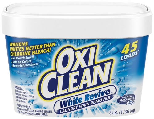 Discover the better, brighter alternative to chlorine bleach! OxiClean White Revive Laundry Whitener + Stain Remover chlorine bleach-free powder whitens whites 40% better than chlorine bleach without the chlorine smell and it's safe on colors. Now you can maintain and revive your dingy white clothes plus remove tough stains keeping them looking like new longer with OxiClean White Revive Laundry Whitener + Stain Remover Powder.Get whiter whites without the worry of chlorine spills. Sparkling whites can brighten any outfit. But your favorite whites can grow dingy over time. And when that happens, what do you use?Reach for color-safe, chlorine-free OxiClean White Revive Laundry Whitener + Stain Remover Powder. It works with your detergent, removing stains, keeping colors looking bright and washing whites back to perfection. Use as a presoak and add it to every load! Follow directions as per label. You'll get the fresh-looking whites you love.Specifications