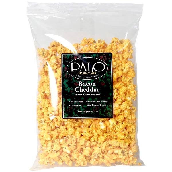 Our Bacon Cheddar, the latest addition to the Palo Popcorn lineup, has become one of our most popular sellers and most talked about flavors. Pure coconut oil, non-GMO seed, salt, REAL cheddar cheese, and our unique bacon seasoning. Mmm...Bacon.Specifications