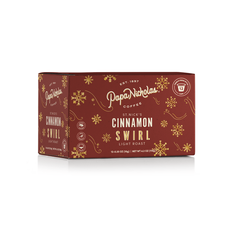Make your mornings merry and bright with PapaNicholas Holiday Single-Serve Coffee Pods. These festive flavors are ready at the push of a button. Perfect for busy mornings, holiday gatherings, or when you just want to treat yourself, this collection brings seasonal joy to your cup in seconds. Enjoy the classic holiday favorites in convenient single-serve pods: St. Nick's Cinnamon Swirl - a cozy, cinnamon-spiced favorite that feels like a holiday tradition. PapaNicholas crafts each blend with care, selecting premium beans and roasting them to bring out their best flavors. Every coffee pod is sealed for freshness, so you can enjoy barista-quality taste and aroma whenever you want it. Whether you're entertaining guests, giving the perfect stocking stuffer, or simply taking a break from the holiday rush, PapaNicholas Holiday coffee pods are a delicious way to celebrate the season.Specifications