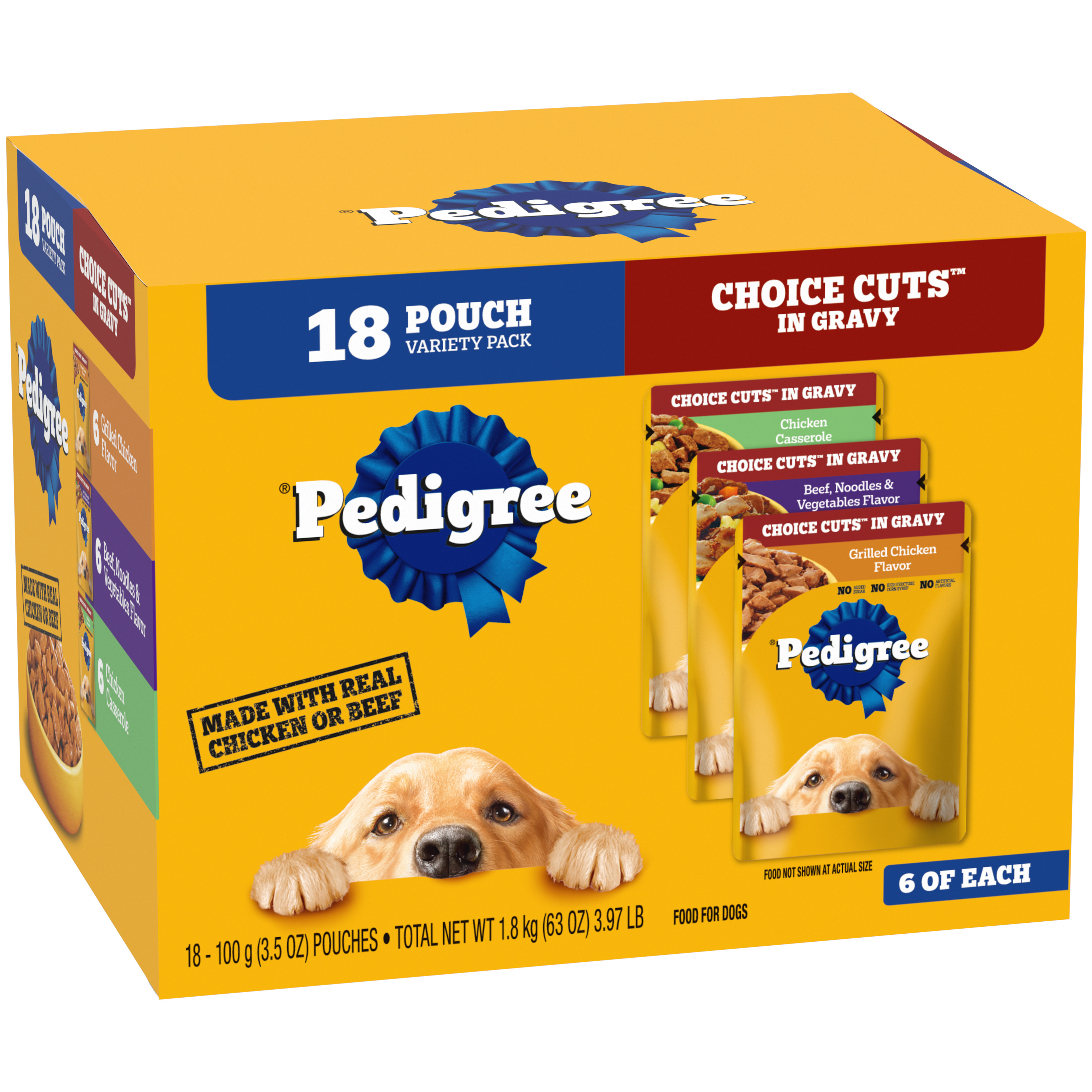 Pedigree Choice Cuts In Gravy Dog Food is 100% complete and balanced food for adult dogs and provides the perfect balance of vitamins and minerals with no artificial flavor, no added sugar, and no hi; Serve as a topper, a mixer with dry dog food or as a complete meal!