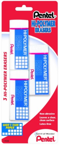 Erases cleanly with no dust left behind; High-quality large block eraser; Non-abrasive; Pack includes 3 erasers