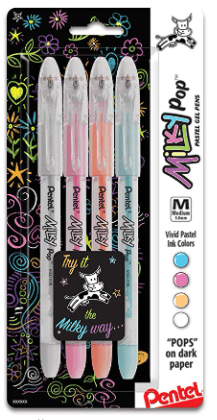 4 per package; Add a pop of color to any page with milky pastel colors; Barrel color- translucent for visible ink supply; Extra-long balanced barrel fits any hand; Grip matches ink color; Ink colors- white pink sky blue orange; Latex-free grip for comfortable writing and drawing; Pocket clip; Smooth gel ink writes on light or dark colored paper; Tip size-medium- 0.8 mm; Writes on photo paper