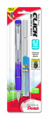 (WE CANNOT GUARANTEE A SPECIFIC COLOR) If you'd like us to choose for you, we are more than happy to do so. If not, please come visit us in store to pick your favorite color. Mechanical pencil features a side-click lead advance transparent barrel design and a latex-free comfort grip. Convenient side button allows the 0.7mm lead to advance effortlessly without changing hand position. HB lead inside is equivalent to a No. 2 wooden pencil and scans on standardized tests. Turn dial left to advance eraser and right to retract. The refillable extra-long twist-up eraser feature allows longer use. Twist Erase Click Mechanical Pencil is refillable with Pentel Super Hi-Polymer Lead and E10 jumbo refill eraserSpecifications