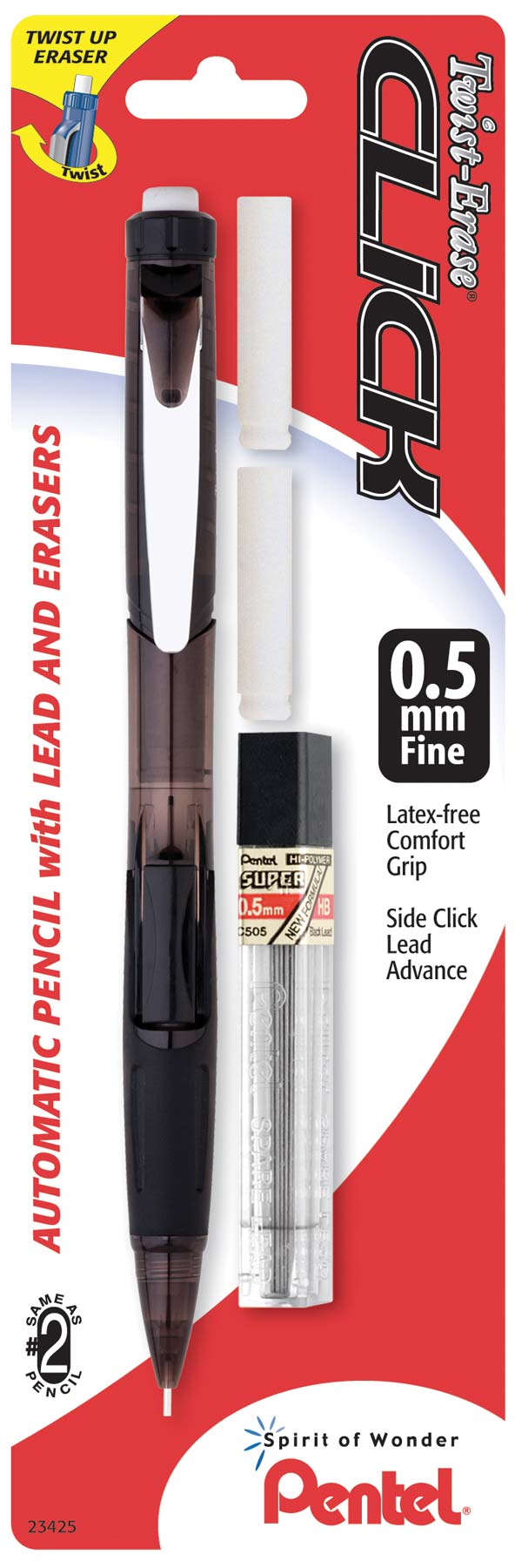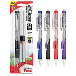 Assorted barrel colors; Frequent mistakes are no match for the larger than ordinary and long-lasting twist-up eraser; Guaranteed to scan on standardized tests; Maximum comfort and control with the latex-free grip; Pre-loaded with Pentel Super Hi-Polymer HB lead same as a #2 pencil; Quick-click side button advances lead without interrupting your writing