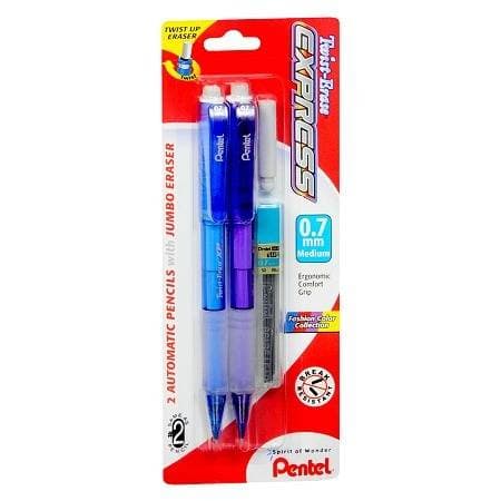 Twist-Erase Express Automatic Pencil features a 1-1/4 tall twist-up eraser for long-lasting use. Latex-free grip has extended coverage on the lightweight barrel for writing versatility. Design includes a top click stationary tip and fixed sleeve. Refillable with Pentel Super Hi-Polymer lead and E10 jumbo eraser.Specifications