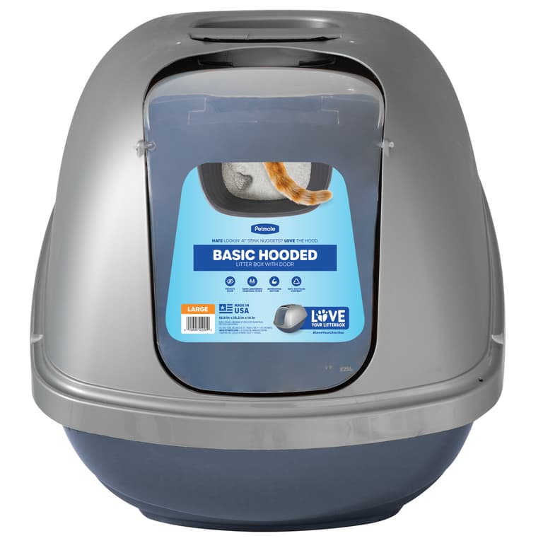 The Petmate Basic Hooded Litter Pan combines multiple features in one litter box making this a great pan for your cat. A lowered entry point provides easy access for cats of all ages and the removable door gives your cat extra privacy. High walls and a hood keep litter inside the litter box instead of scattering it onto your floors. Made in the USA with durable plastic with a reinforced bottom for easy cleaning. The hood features a molded handle and includes an odor-absorbing replaceable carbon filter that helps eliminate odors to keep your home smelling fresh. Pair with a litter catcher mat to keep your cat's litter area even tidier.Specifications