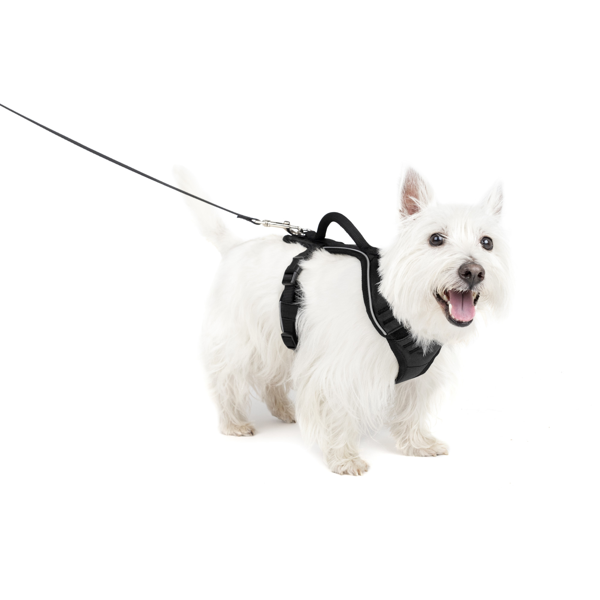The EasySport Harness was designed with your active dog in mind, so he'll have a harness that can keep up with him on your next adventure together. This harness is made of durable padded fabric to withstand each day hike or jog around the neighborhood. The EasySport Harness is padded throughout to help keep your dog comfortable all day long. The elastic neckline easily slides over your dog's head when you take the harness on and off, flexing around his neck as he moves for an extra-comfy fit. This harness also has a rear-leash attachment point so your dog won't trip on his leash when he's on the go. This harness is fully adjustable for dogs of all shapes and sizes. It has 2 buckles, making it quick and easy to get on and off. The handle on this harness gives you an extra degree of safety when you need to control your dog quickly or guide him in the right direction. And for evening walks around the neighborhood, the reflective piping on the harness helps cars see you for added safety. Your pet deserves the best. Trust PetSafe to help keep your pet healthy, safe and happy.Specifications