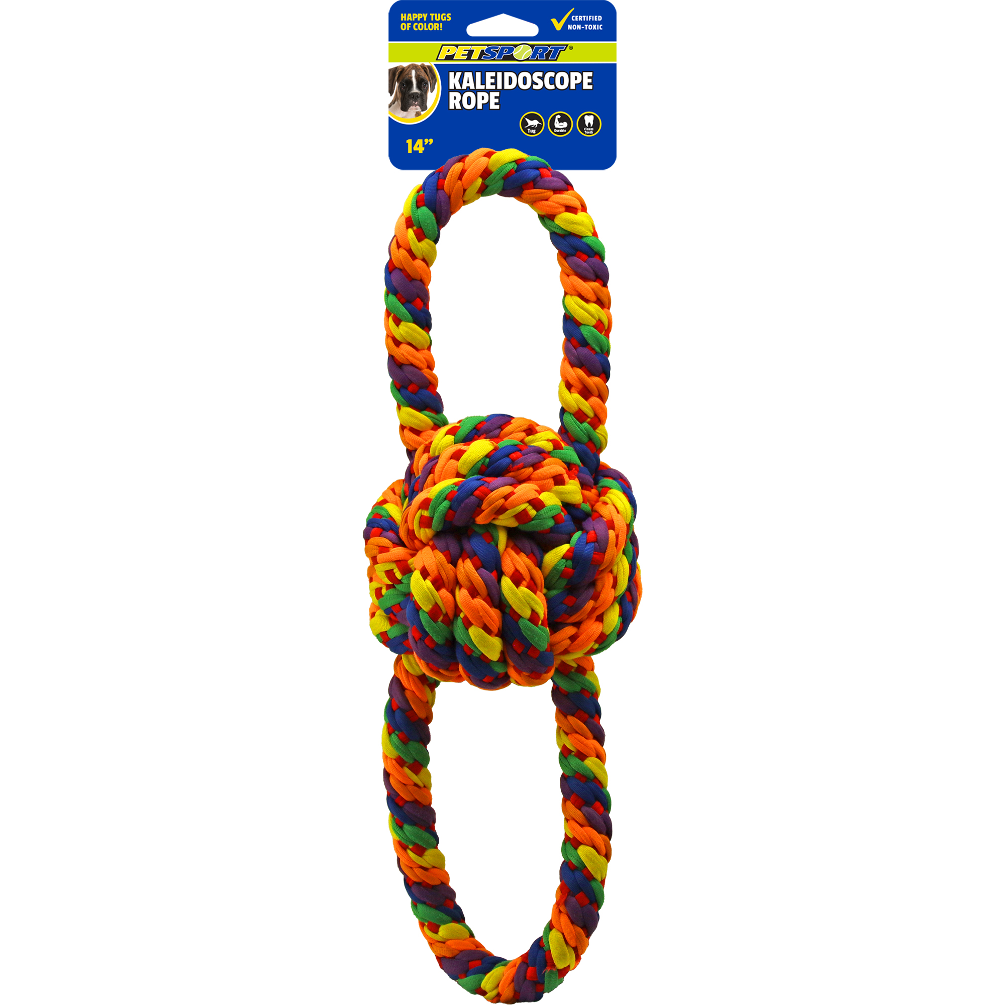 Kaleidoscope Rope Tug is a super strong tug toy; Made with premium woven 15mm jersey rope; Perfect for heavy chewers, teething puppies and dogs who love tug-of-war; The natural fibers also help keep teeth & gums healthy; This 14" rope tug is extremely durable