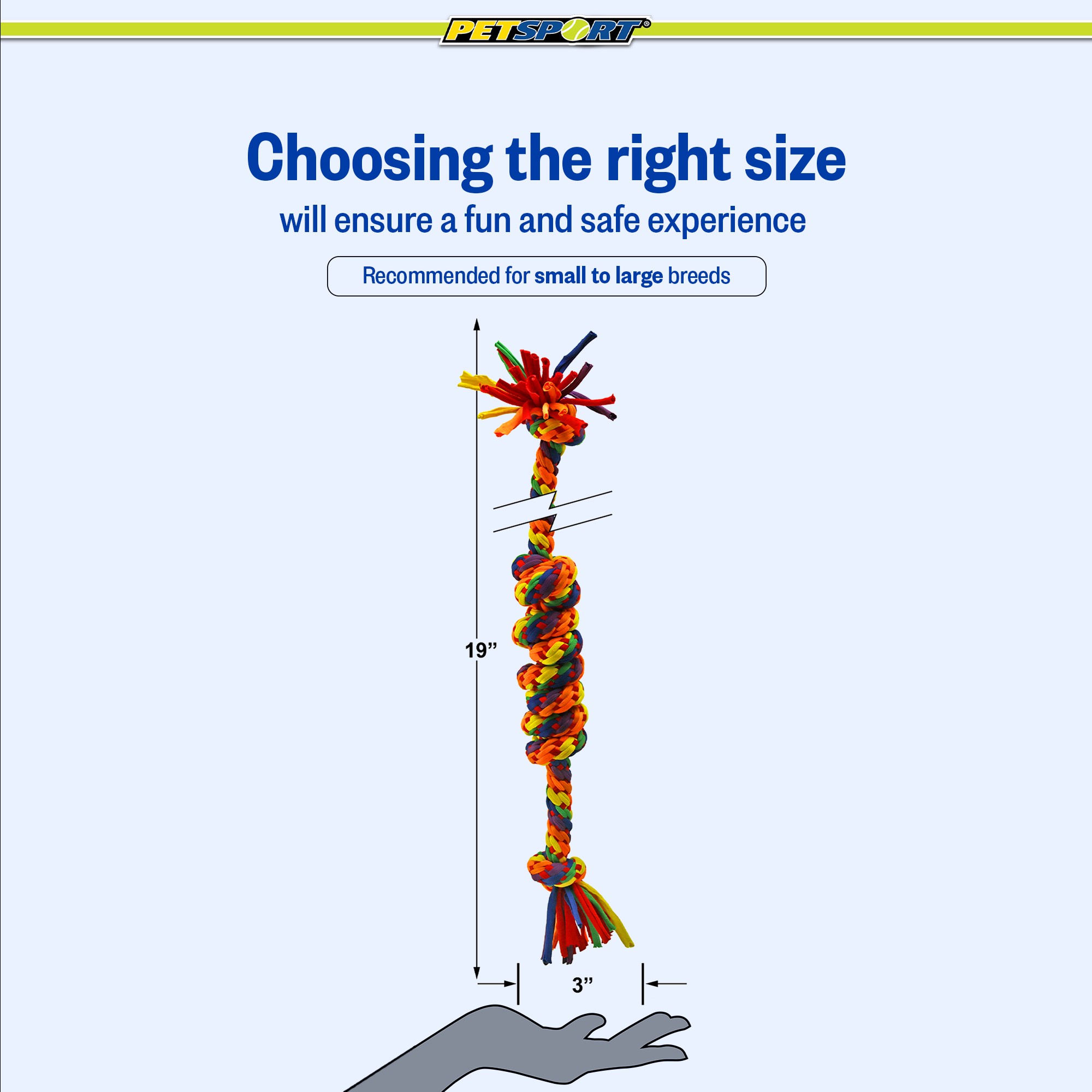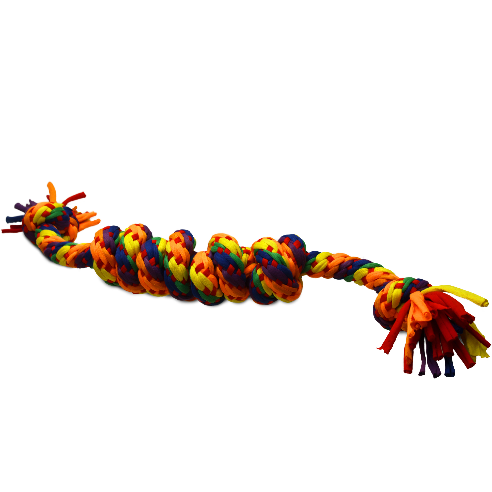 Kaleidoscope Rope Tug is a super strong tug toy made with premium woven 15mm jersey rope and knot bar. This 19" rope tug is extremely durable so they're perfect for heavy chewers, teething puppies and dogs who love tug-of-war. The natural fibers also help keep teeth & gums healthy. This toy handles it all! Give your pup a challenge they’ll love. Your furry friend will find satisfaction with Kaleidoscope Rope Tug, whether it's interactive or solo time. Kaleidoscope Rope Tug is made for small to large dogs.Specifications