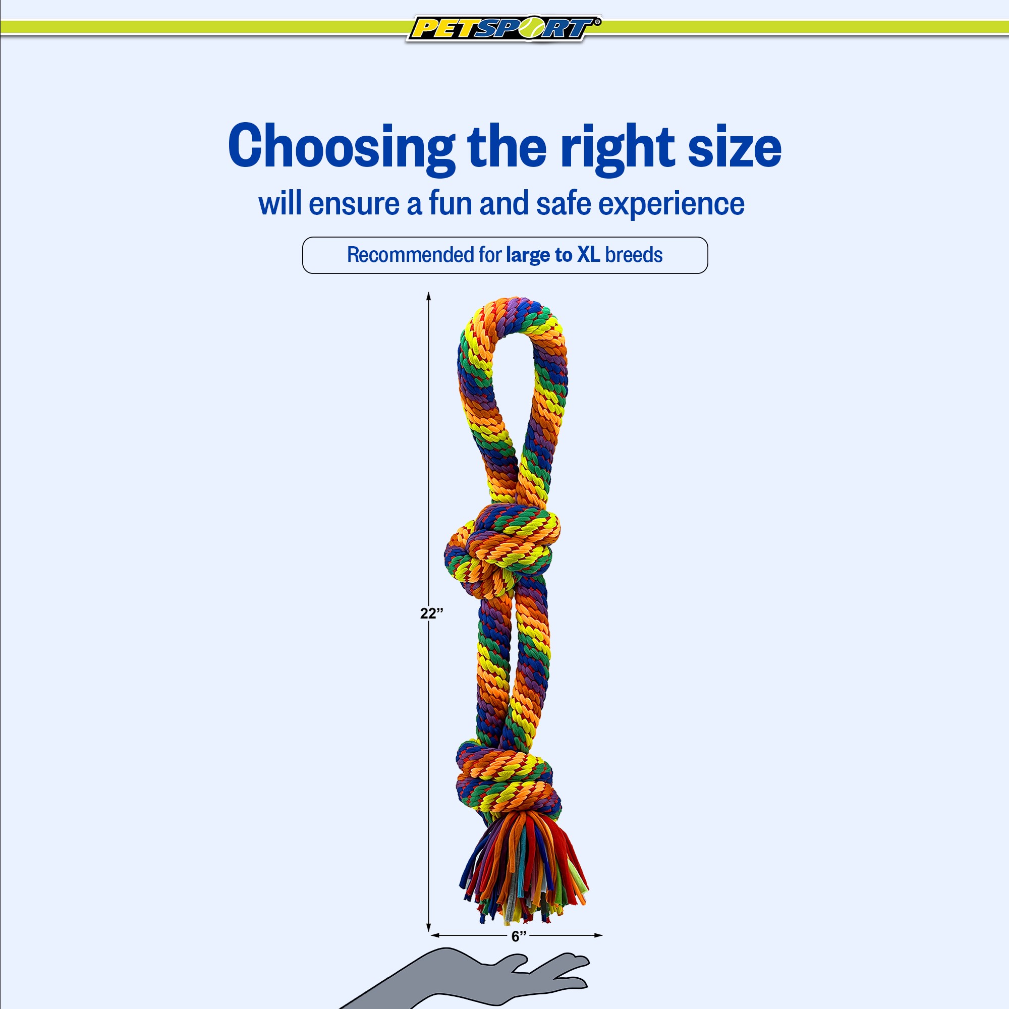 Kaleidoscope Rope Knot Tug is a super strong tug toy made with premium woven 25mm jersey rope. This 22" rope tug is extremely durable so they're perfect for heavy chewers, teething puppies and dogs who love tug-of-war. The colorful fibers also help keep teeth & gums healthy. This toy handles it all!. Give your pup a challenge they’ll love. Your furry friend will find satisfaction with Kaleidoscope Rope, whether it's interactive or solo time. Kaleidoscope Rope Knot Tug is made for large to XL dogs.Specifications