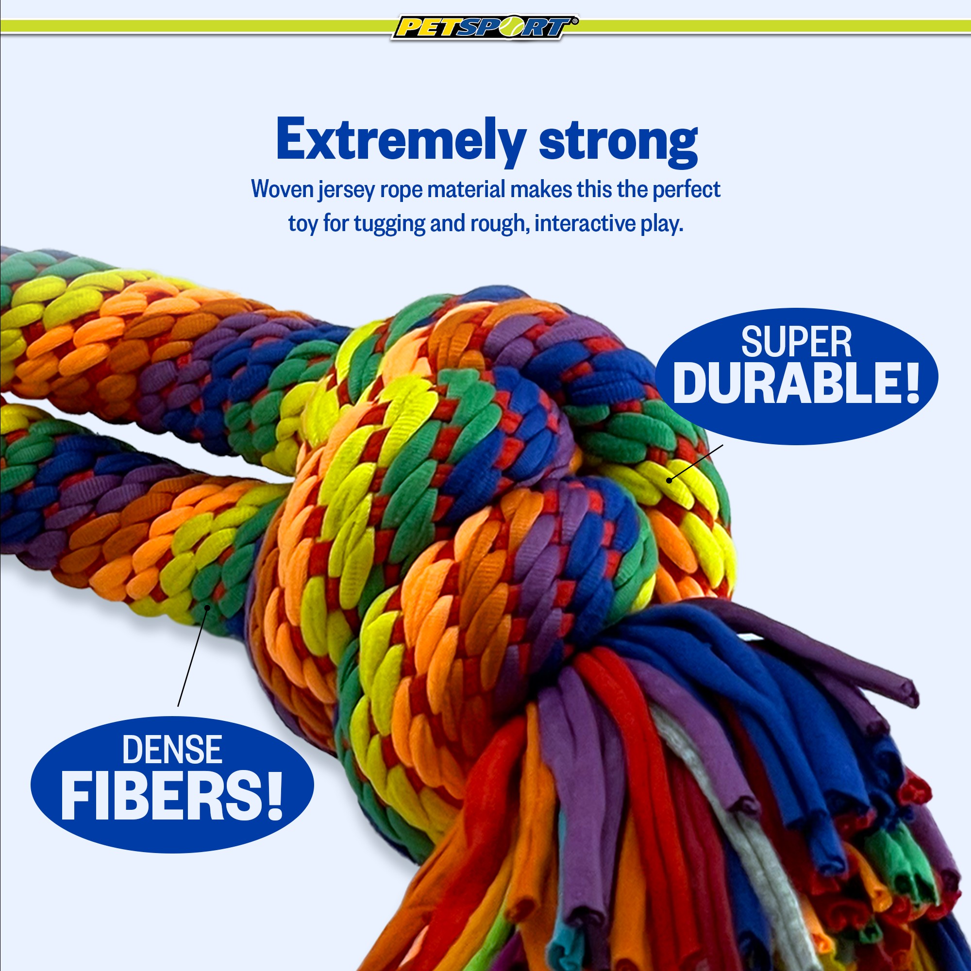 Certified Non-toxic; heavy chewers, teething puppies; Kaleidoscope Rope Knot Tug; Made with premium woven 25mm jersey rope; Non-abrasive fibers keep teeth healthy