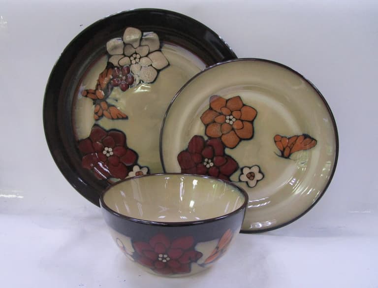 12-PIECE DINNERWARE SET INCLUDES 4 EACH OF: 10 3/4" DINNER PLATE, 8 3/4" SALAD PLATE, 6" ALL PURPOSE BOWL; DISHWASHER AND MICROWAVE SAFE; MADE WITH HIGH QUALITY STONEWARE; PAINTED BUTTERFLY; PFALTZGRAFF 12PC DINNERWARE SET