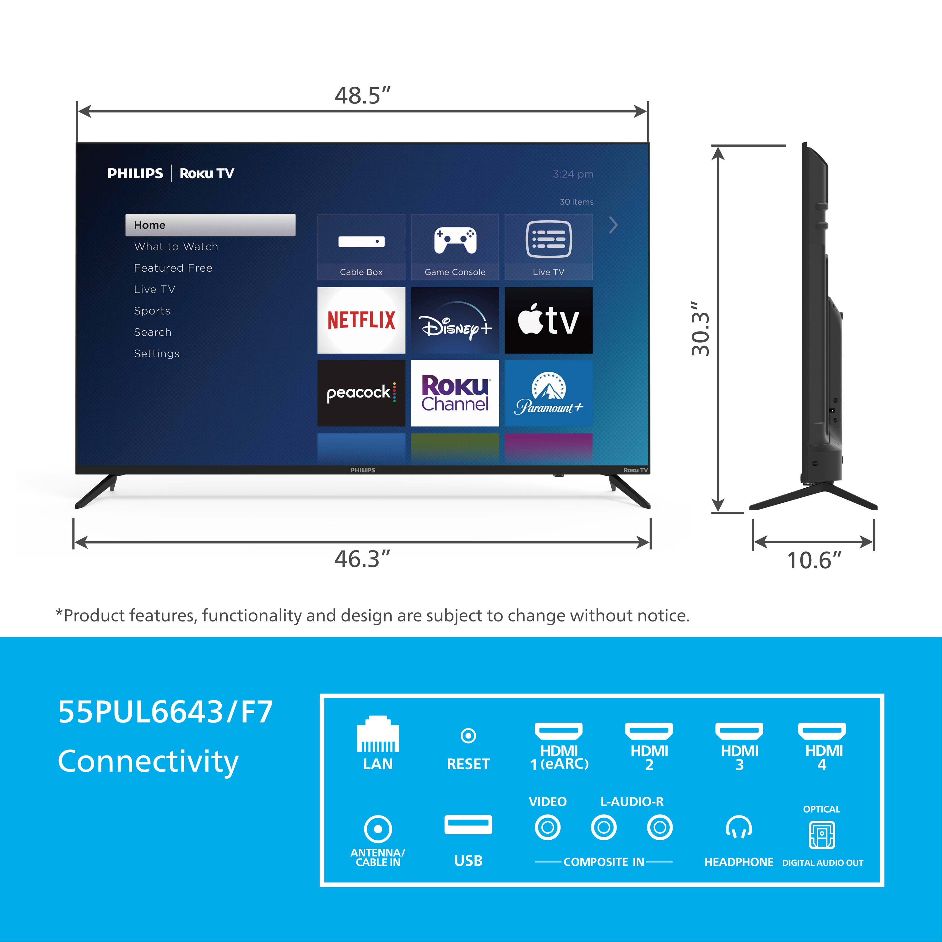 Smart TV Made Easy, enjoy the beauty of 4K UltraHD TV. With a simple home screen, easy to use remaote and automatic software updates, this Phlips Roku Tv is Smart TV that’s simple to use and easy to love. Sleek European design, Bright 4K LED TV with Vibrant picture. Includes 120 Perfect Motion rate, to reduce image ghosting on sports cast and shows with fast movement. Fast and Easy search, 150,000 movies and TV episodes, free streaming on the Roku Channel. Watch, Listen, Share with Apple Airplay. A perefct fit for the Smart Home.Specifications