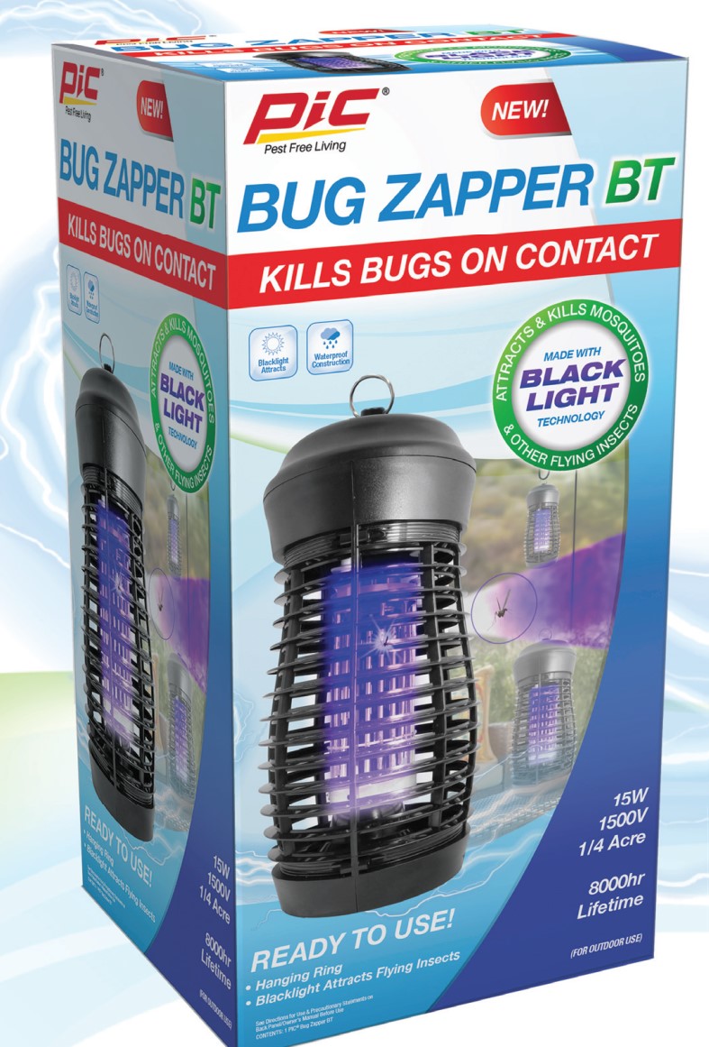 The Pic Pest Free Living Deluxe Bug Zapper is equipped with black light technology and a 1,500V zapping grid that kills bugs on contact. This product is to be used outdoors.Specifications