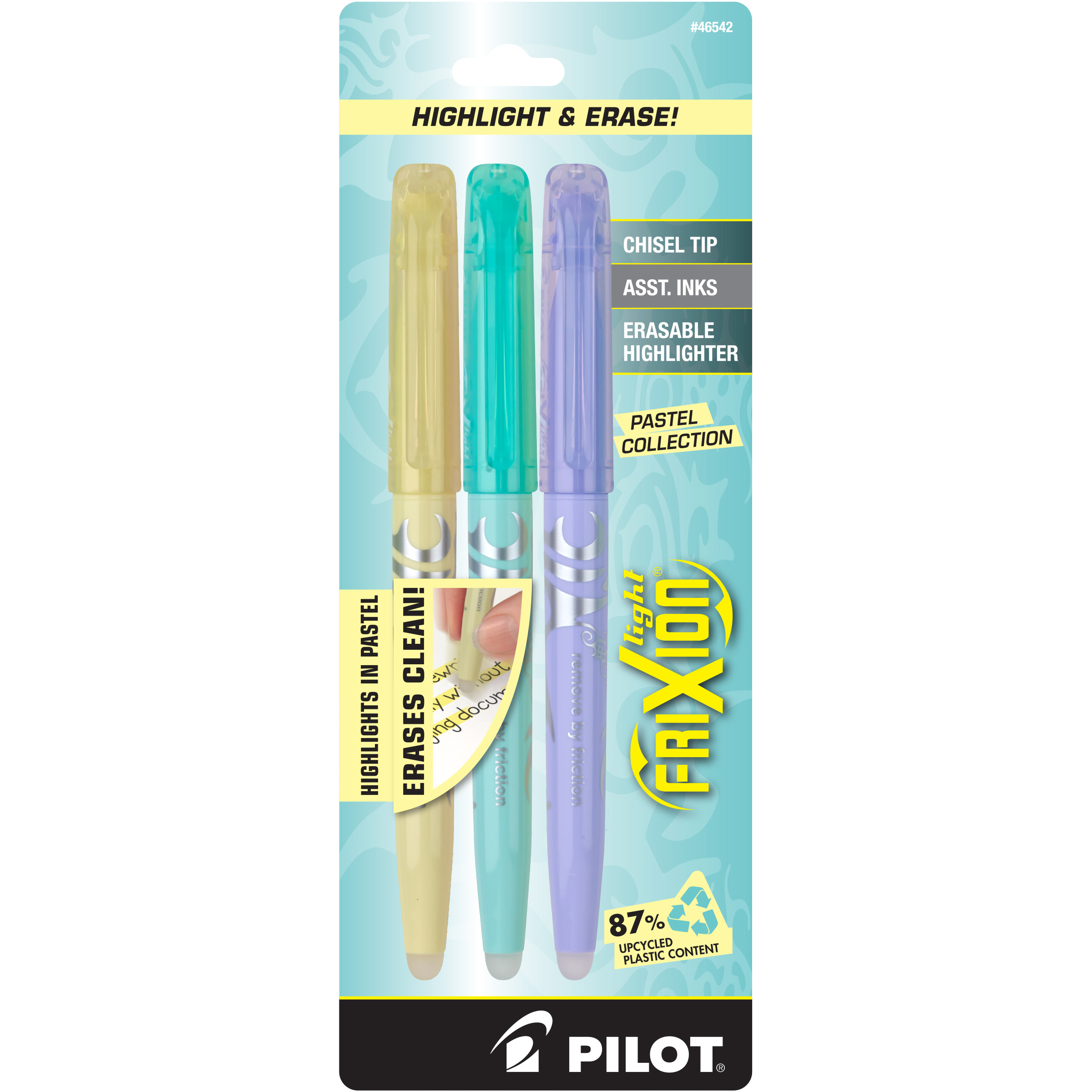 Erases clean; Highlight and erase repeatedly without damaging books or documents; Highlights bright; Pastel colors; Unique thermo-sensitive ink formula disappears with the erasing friction
