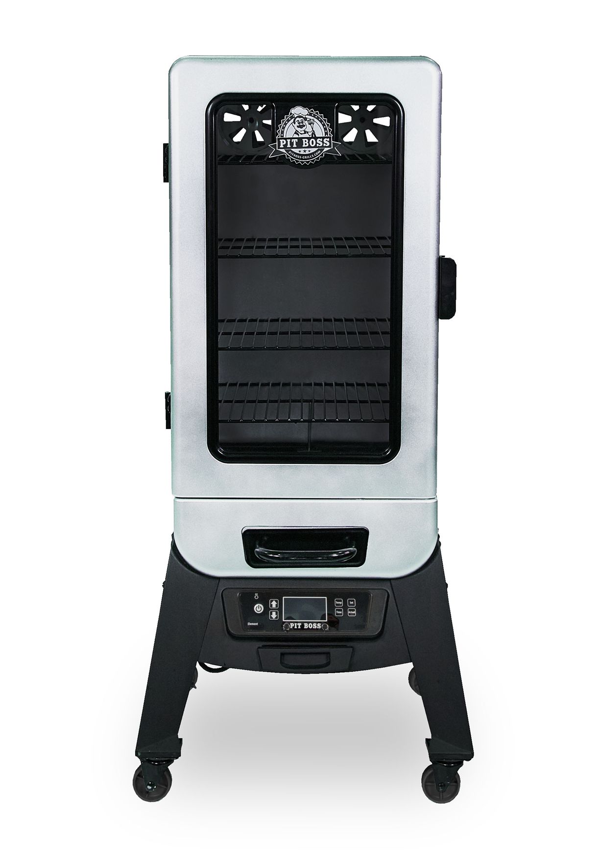 There’s a new boss in town introducing the Pit Boss 3-Series Digital Electric Smoker. Gone are the days when your smoker was just another black box. The 1650-watt Smoker features a large front window that eliminates the need for peek-a-boo cooking, 684 square inches of porcelain coated cooking racks, locking caster wheels, an easy to read digital controller, a meat probe, and a stunning silver finish. Its innovative design improves upon the features of a classic smoker by incorporating an elevated stand for easy loading and unloading, a multiple position racking system that ensures you’ll have enough room to smoke anything your heart (or stomach) desires. The ability to infuse flavor into your smoker is easy with the oversized front load wood chip tray, offering up to two hours of cooking time per load. The superior ground up engineered design gives you the ability to reach higher highs and lower lows. The double walled blanket insulation lets you smoke from 100°F to temperatures reaching 350°F, unlike any other Smoker on the market, and allows you to get the crispy skin on poultry or that great bark on beef and pork.Specifications