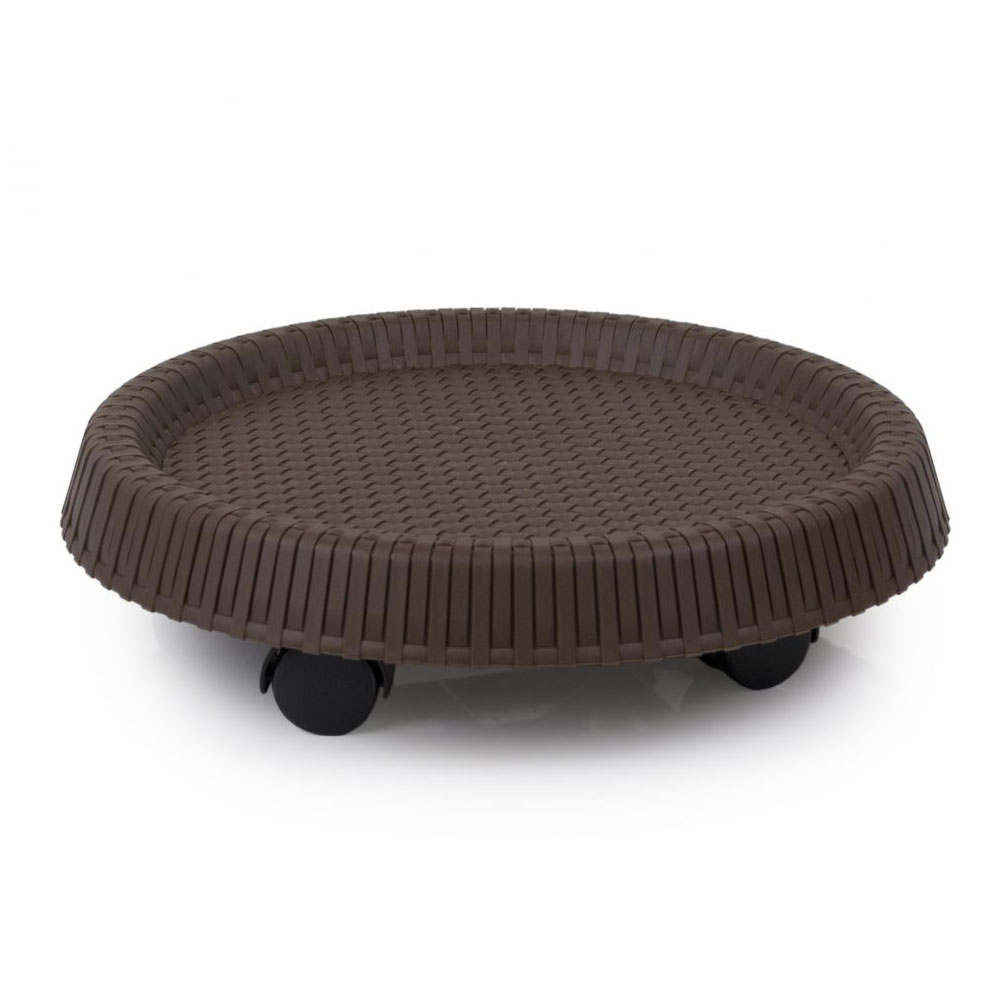 Finally, the plant caddy to match the popular plastic wicker furniture. The caddy is woven around sturdy steel powder coated frames. The plastic saucer included protects floors & patios from excess water & stainsSpecifications