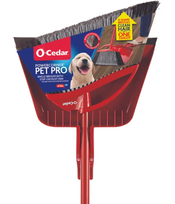 The PowerCorner Pet Pro Broom and Dust Pan system is the perfect combination for all sweeping needs, ESPECIALLY pet hair pick-up and disposal. The PowerCorner Pet Pro Broom bristle technology cleanly sweeps up dirt and debris both indoors and out. The patented V-Shape bristle design provides 2X better floor contact than straight trim bristles and clean hair, dirt and debris in one sweep. Firm black bristles thoroughly pull dirt from corners. Semi-soft gray bristles capture and move dirt effectively, so you don’t have to double sweep the floor. Flare-Tip Memory Bristles are made from 80% recycled plastic. Removes over 99% of common household dust and dirt like long grain rice, sugar, hair and cereal in one sweep, as tested at an independent accredited lab . The Step-on Dust pan has cleaning combs that remove 3X more hair than standard dust pans, hand free. Step-on design seals the lip to the floor for quick, easy pick up. Anti static technology molded into the dustpan releases dirt into trash with a tap. Clips to broom handle for easy storage.Specifications