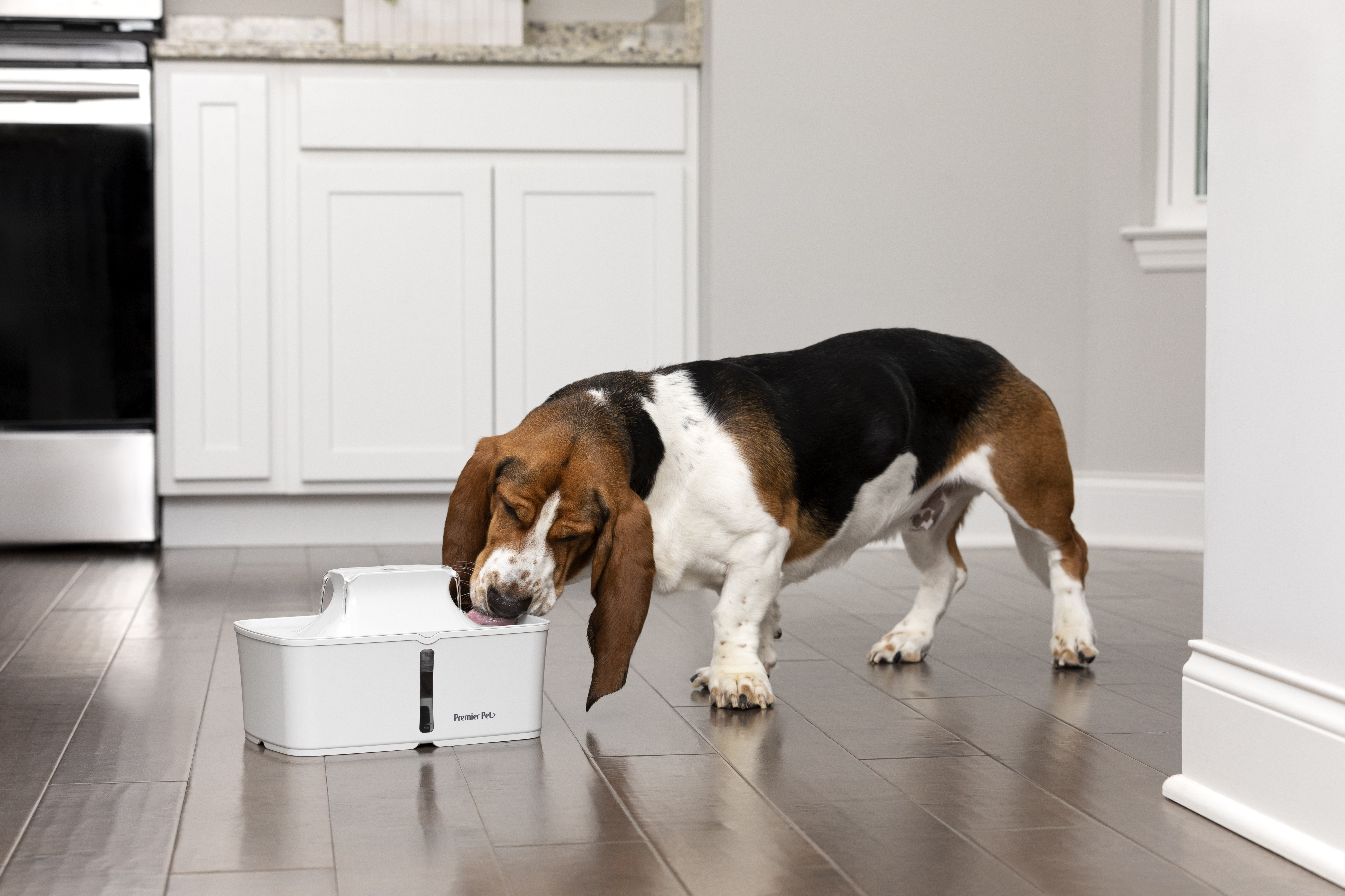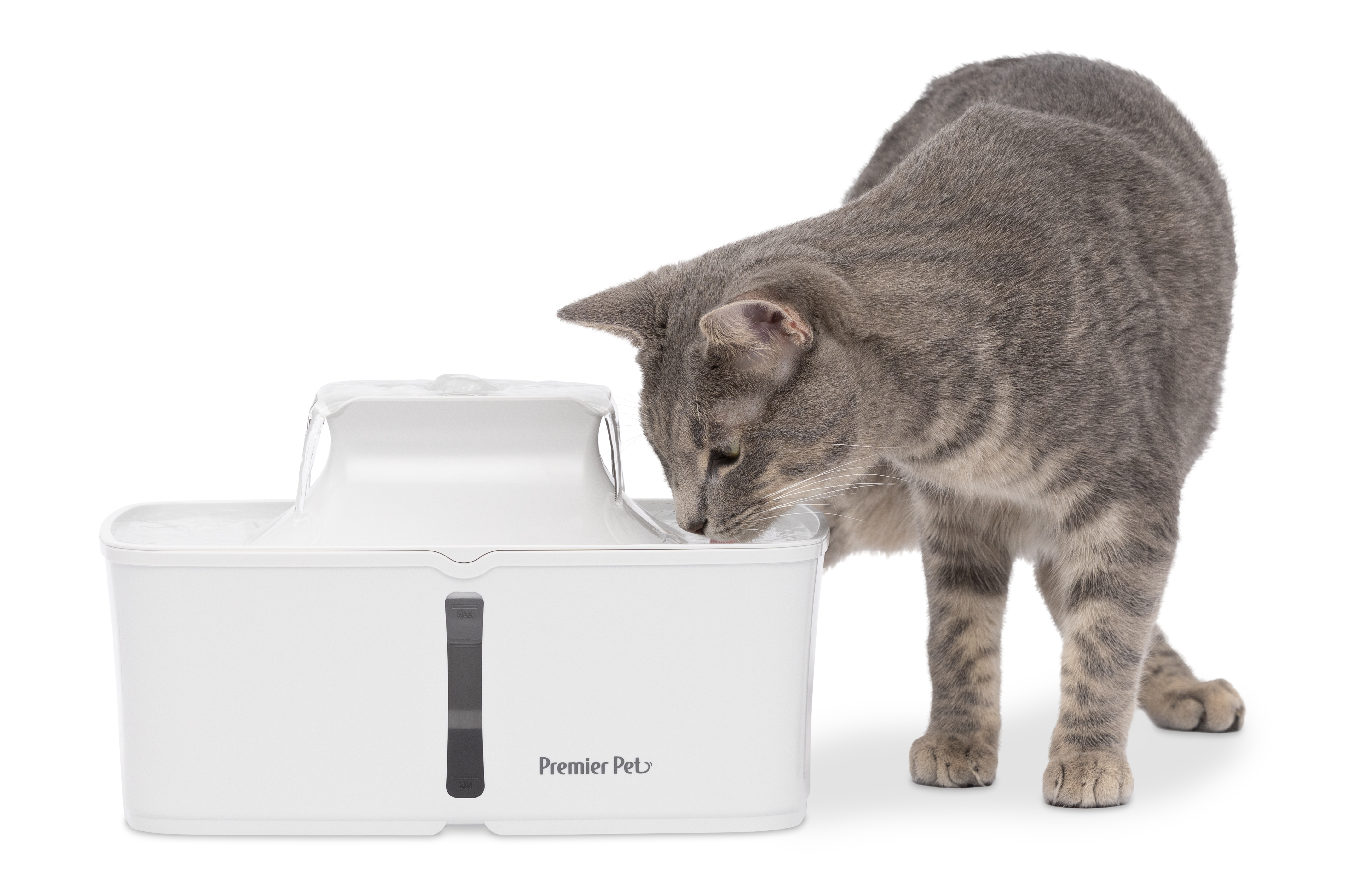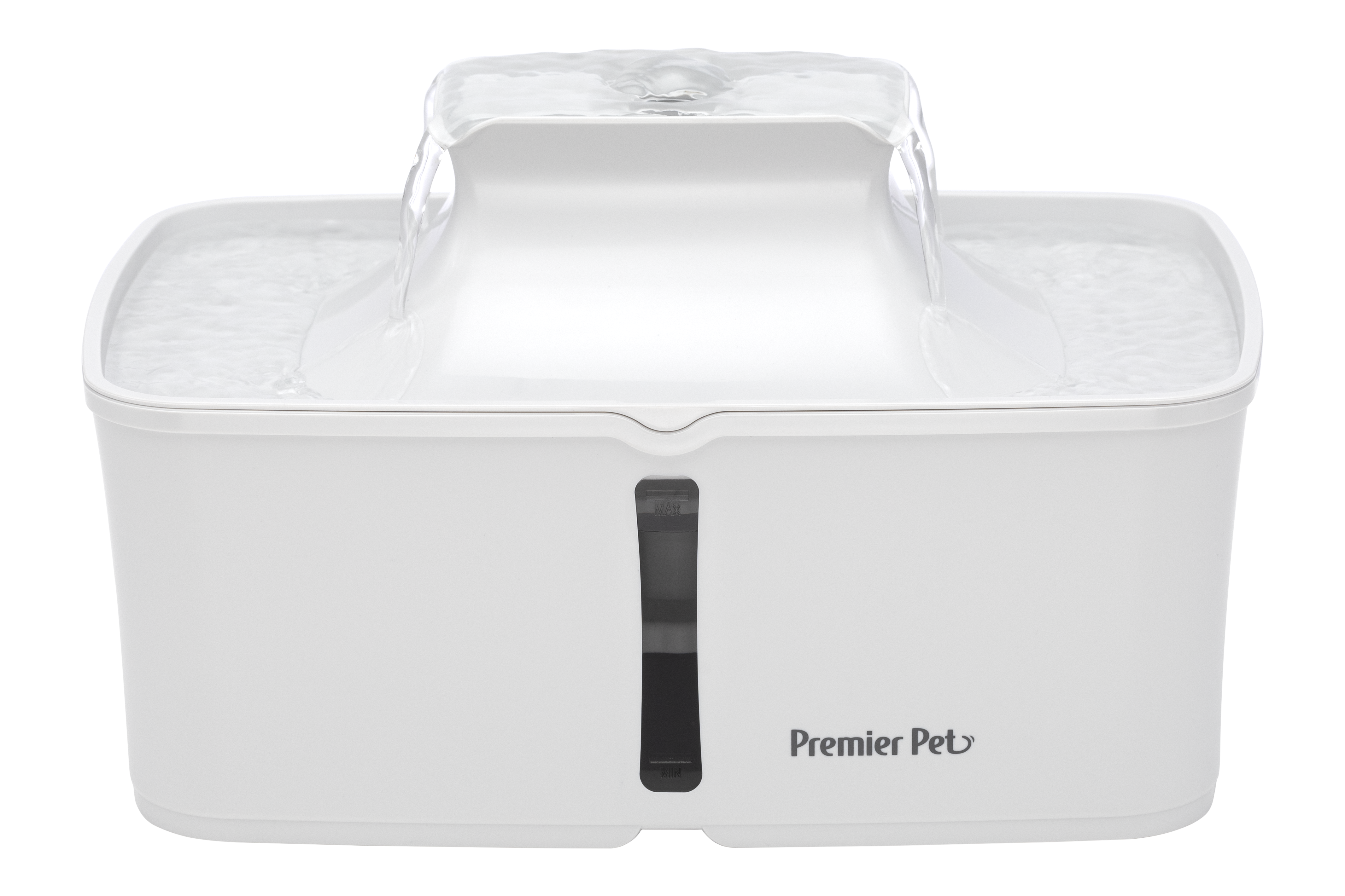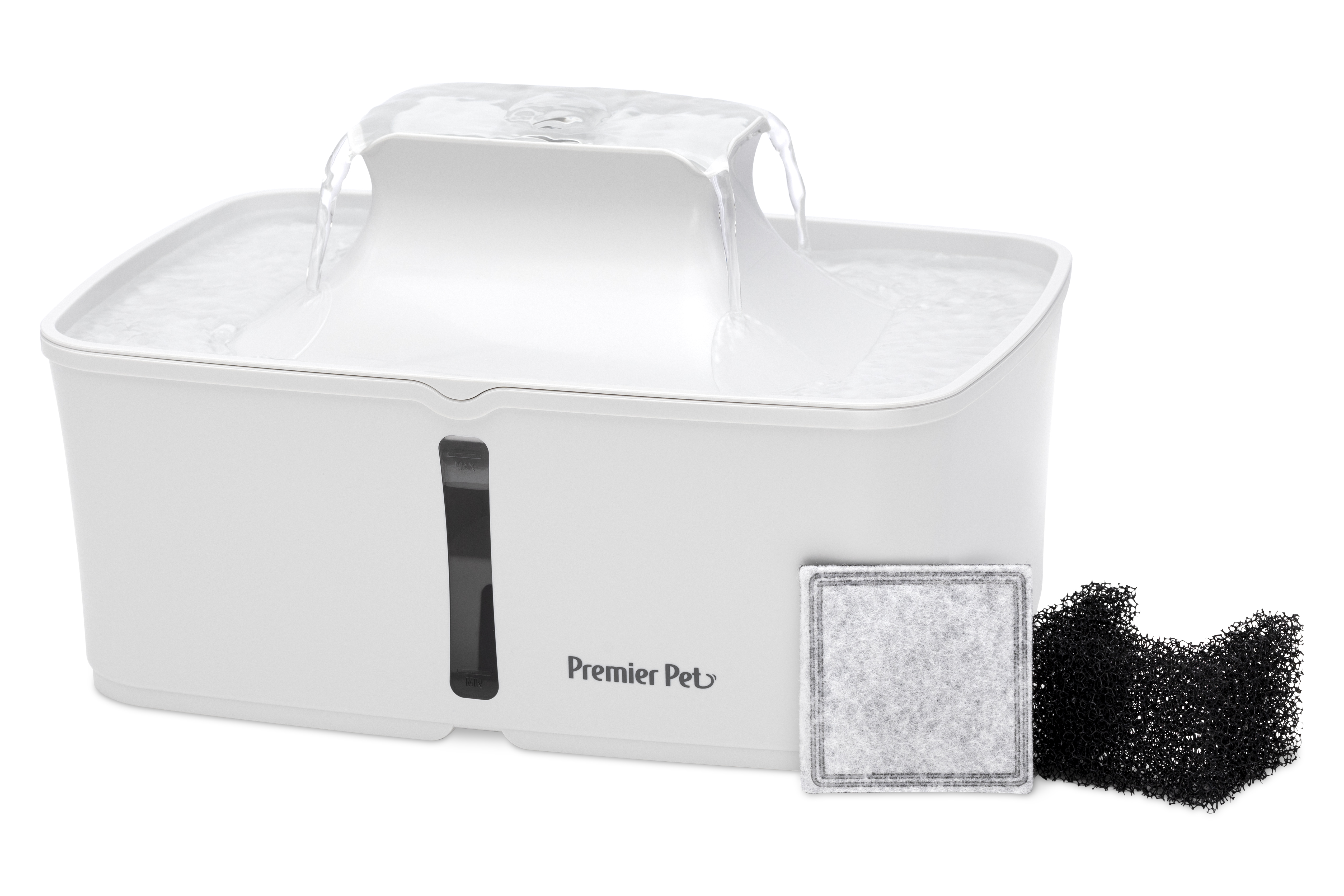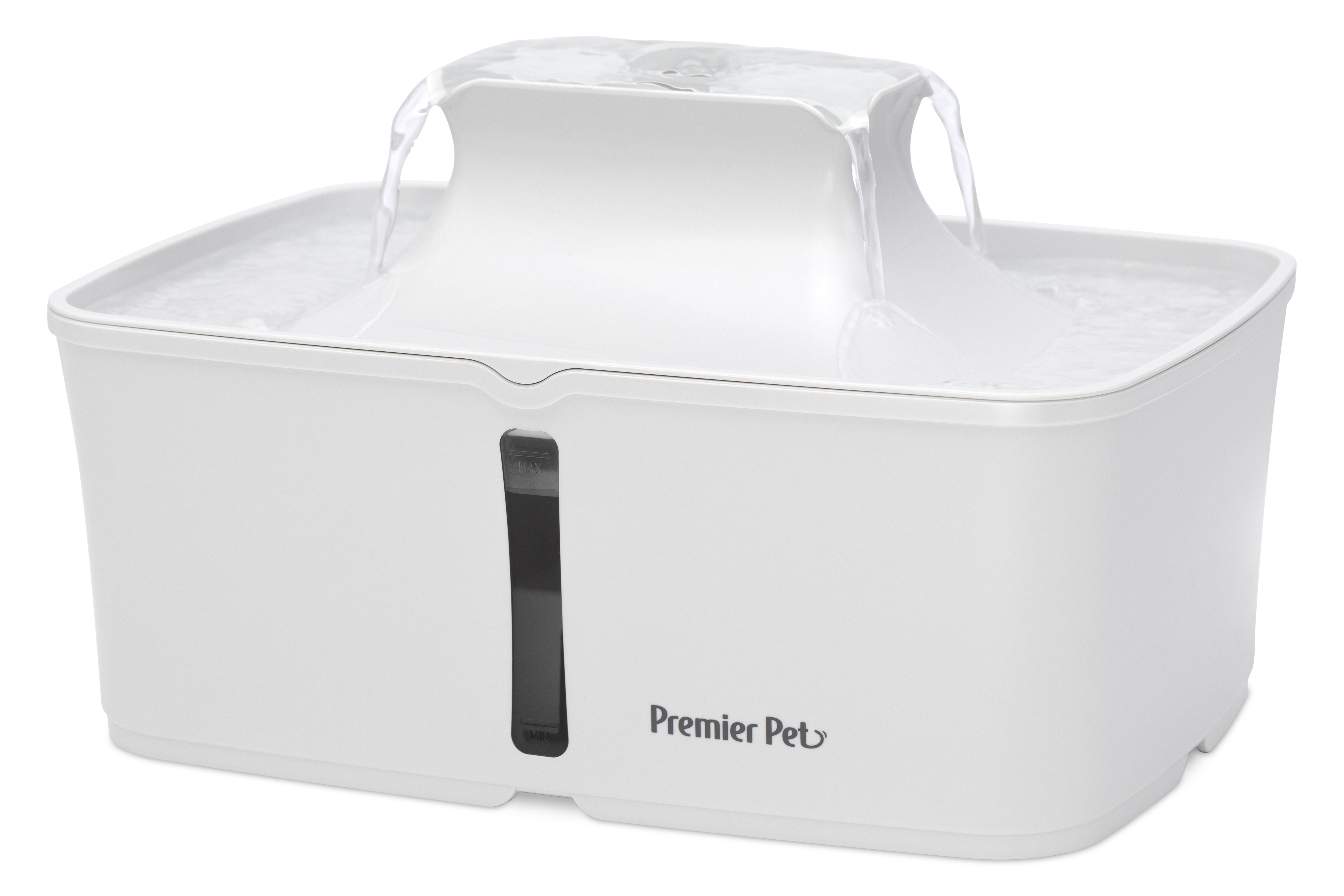 The NEW Premier Pet 128 oz. Pet Fountain provides your pet with one gallon of fresh, filtered drinking water. Flowing water encourages pets to drink more, therefore promoting proper hydration to support urinary and kidney health. A built-in Dual-Filter System includes an activated carbon filter to remove bad tastes and odors and a foam filter to remove dirt and hair. Constant circulating water, which can be adjusted with a flow-control knob, helps to prevent bacteria growth, keeping the fountain cleaner than a standing water bowl. The new sleek, compact design offers a water level window to easily view refill need and multiple drinking options for your pet: four free-flowing streams or the lower bowl with still water. The BPA-Free plastic design comes apart to make cleaning easy and is top-shelf dishwasher safe (excluding pump). Give yourself the happier, healthier pet you deserve by giving them the Premier Pet 128 oz. Pet Fountain!Specifications