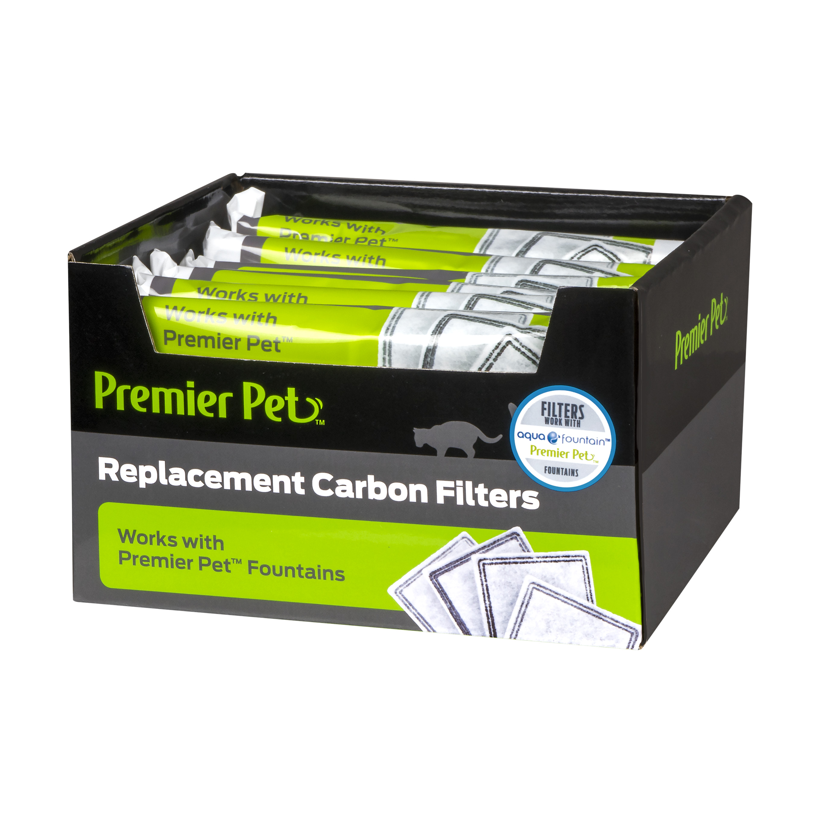 Activated carbon is made from coconut shells; Pack of 4 carbon filters compatible with Premier Pet Fountains also Aqua Fountain; Removes bad tastes and odors from the water; Replace every 2 to 4 weeks depending on the number of pets using the fountain; Rinse before inserting into filter housing