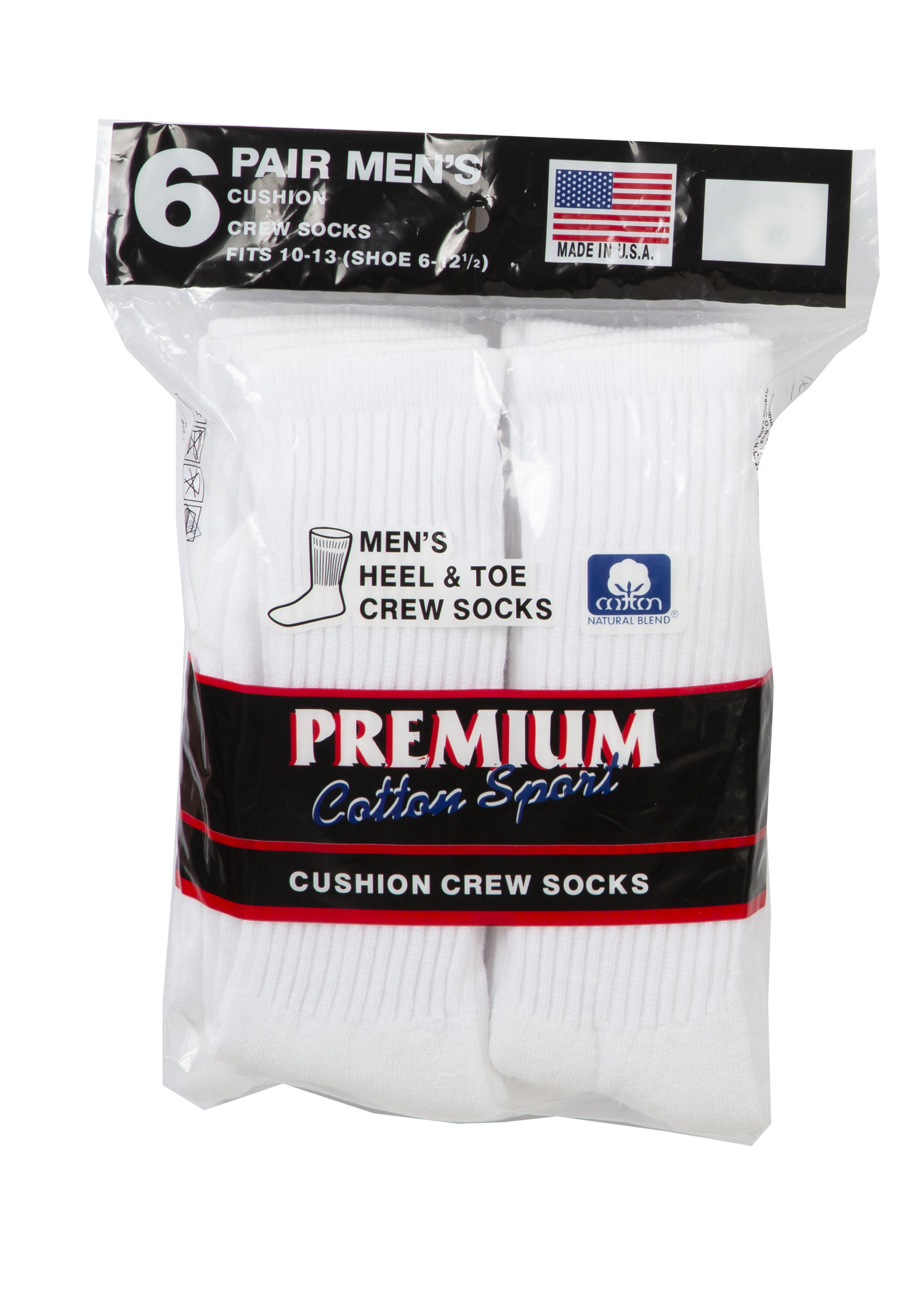 6 PAIR MENS CUSHION CREW SOCKS. WHITE. FITS SHOE SIZE 6-12 1/2 SOCK SIZE 10-13. MADE IN THE USA.Specifications
