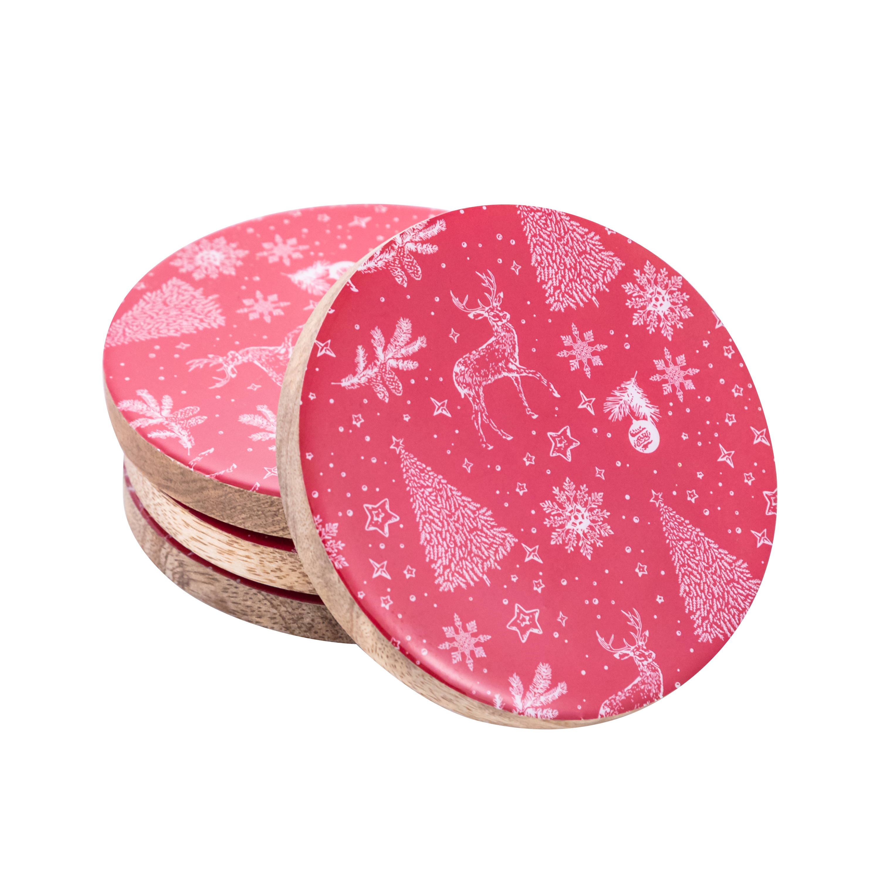 Mango Wood Coasters with Red Reindeer Decal Design.; Size 4" x 4".