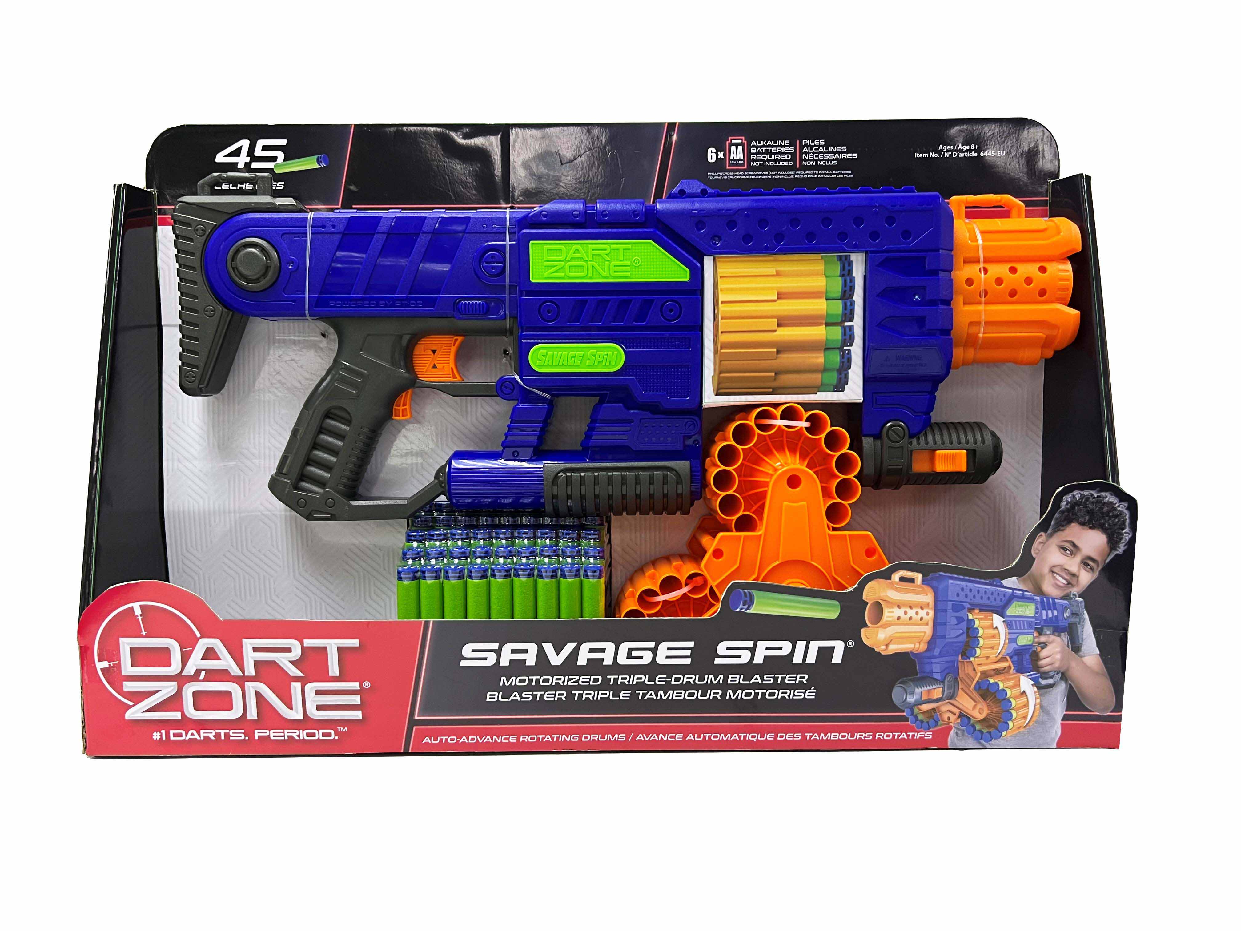 Savage Spin is ready for dart battle. It’s endless fun with the new motorized Triple Drum Blaster. Designed with auto-advanced triple rotating drums, this unique motorized dart blaster holds 45 darts and fires up to 80 feet. Includes a Tactical Telescoping Stock that extends up to 2 feet to customize for the perfect shot. Hold down the Rev-Trigger to power-up the flywheels and then pull back the primary trigger to send darts flying up to 80 feet. Requires 6 x AA Batteries (Batteries Not Included)Specifications