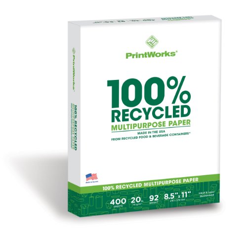 20lb 92 bright white for better contrast and color reproduction; Compatible for use with laser/inkjet printers and copiers; Includes 400 sheets of 8.5 x 11 copy paper poly-wrapped for package durability; Perfect for printing reports presentations school projects and more; Premium Printworks quality since 1964; PrintWorks 100% Recycled Multipurpose paper is made in the USA from recycled food and beverage containers and other paper-based printed materials