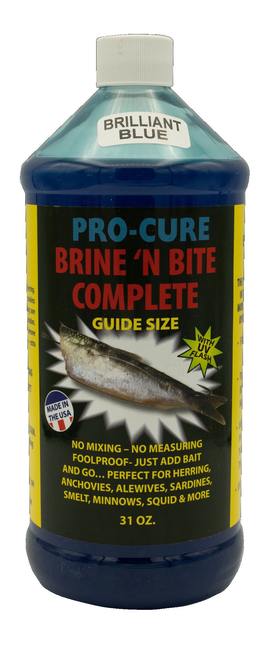 The same great formula as Pro-Cure's legendary Brine 'n Bite Powder, without all the hassles of measuring powder, water, dyes, UV, and brighteners. Brine 'n Bite Complete has it all! All the liquids contain Pro-Cure's proprietary blend of amino acids to trigger aggressive strikes. So if you're just doing a few trays of bait, save all the hassles and grab a bottle or two of Brine 'n Bite Complete.Specifications
