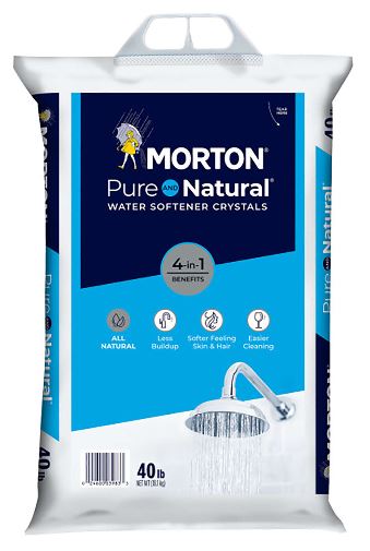 Morton Pure and Natural Water Softener Salt is made from all natural, high purity salt crystals. For the many households that have hard water, it is a natural solution for softer water that provides many added benefits. Using Morton Water Softener Salt Crystals help not only to decrease the buildup hard water can cause in pipes and appliances and make dishes easier to clean, but also leave hair and skin feeling softer after washing and bathing. To continue to see the benefits of Morton Water Softener Salt Crystals, it is recommended that every other month you add between two and four new bags to your tank, depending on the number of people in your household. In order to make carrying and pouring our 40 lb. bags easier, this bag features a sturdy plastic handle and an easy-tear opening.Specifications