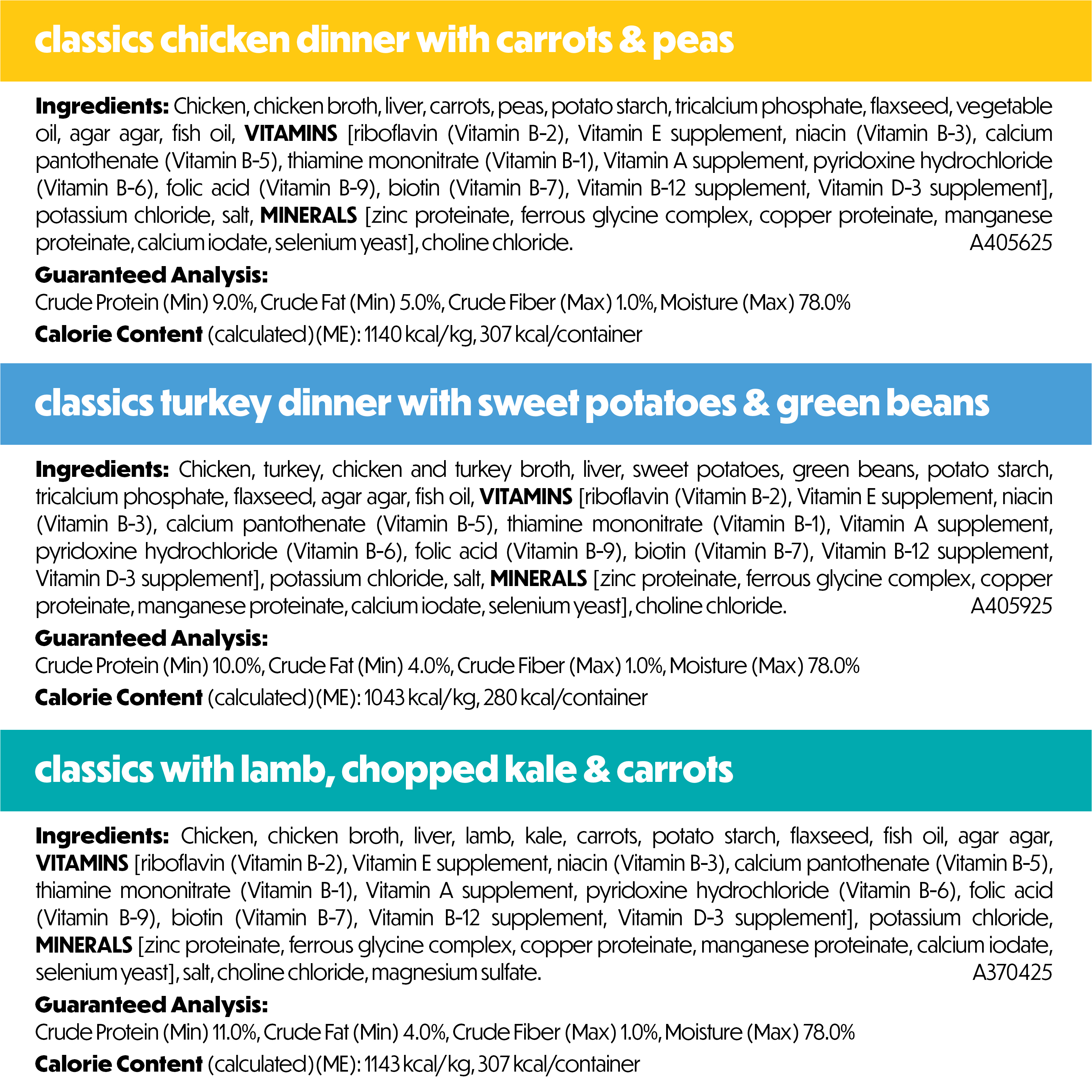 Bring the flavors of chicken, turkey, or lamb and fresh vegetables home to your dog's bowl with Purina Beneful Freshly Prepared Classics adult dog food variety pack. Purina Beneful dog food wet comes with Chicken Dinner with Carrots and Peas, Turkey Dinner with Sweet Potatoes and Green Beans, or With Lamb Chopped Kale and Carrots Wet Dog Food. This dog food wet variety pack features real high-quality proteins with real vegetables in recipes that are made fresh and steam cooked to lock in freshness for adult dog food that bursts with flavor while providing complete protein and 100 percent balanced nutrition for adult dogs. Each container of Classic Creations is re-closable (refrigerate after opening) and is crafted with no artificial colors, flavors, or preservatives so you can feel good about serving this dog wet food at mealtime. Purina Beneful dog food fresh made features textures with delicious flavors that are perfect as stand-alone meals or as a tasty way to add hydration when added to his favorite kibble. Add more excitement to your dog’s day when you feed them Beneful Freshly Prepared Classics Variety Pack.Specifications