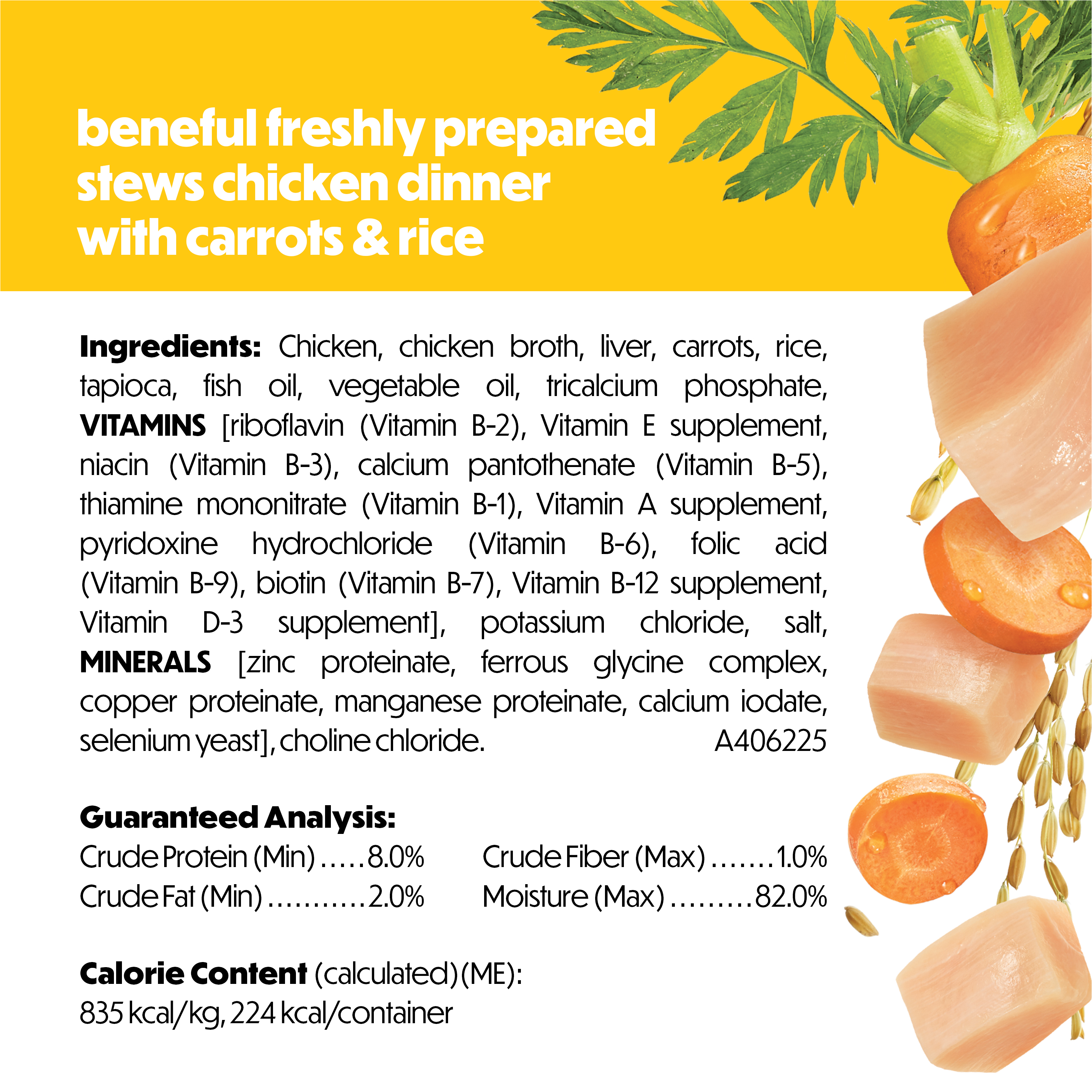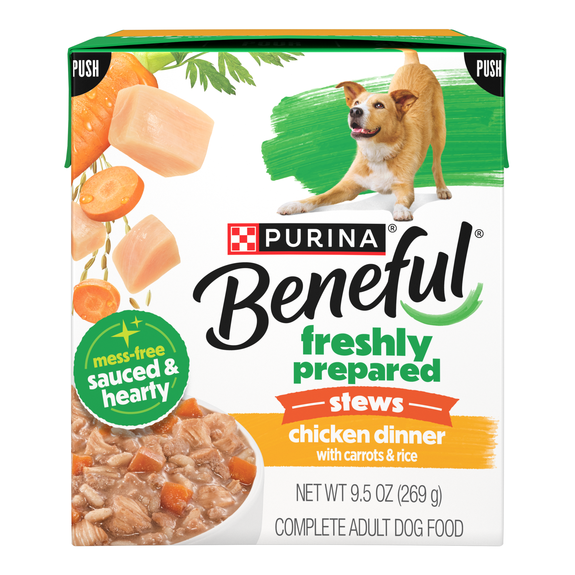 Bring the flavors of real chicken, rice, and fresh vegetables home to your dog's bowl with Purina Beneful Freshly Prepared Stews Chicken Dinner with Carrots and Rice adult dog food. Purina Beneful dog food wet formula features real poultry with real vegetables and grains in a savory gravy to provide quality ingredients you can see in every serving. This delicious wet dog food is made fresh and steam cooked to lock in freshness for a recipe that bursts with flavor while providing complete protein and 100 percent balanced nutrition for adult dogs. Each container of Freshly Prepared Stews is re-closable (refrigerate after opening), offering multiple meals, depending on dog size, for your favorite four-legged friend. Made with no artificial colors, flavors, or preservatives means you can feel good about serving this dog wet food recipe at mealtime. Purina Beneful dog food fresh made features a texture with delicious taste that’s perfect as a stand-alone meal or a tasty way to add hydration when added to his favorite kibble. Choose from a variety of recipes to add some excitement for mealtime to your dog’s day.Specifications