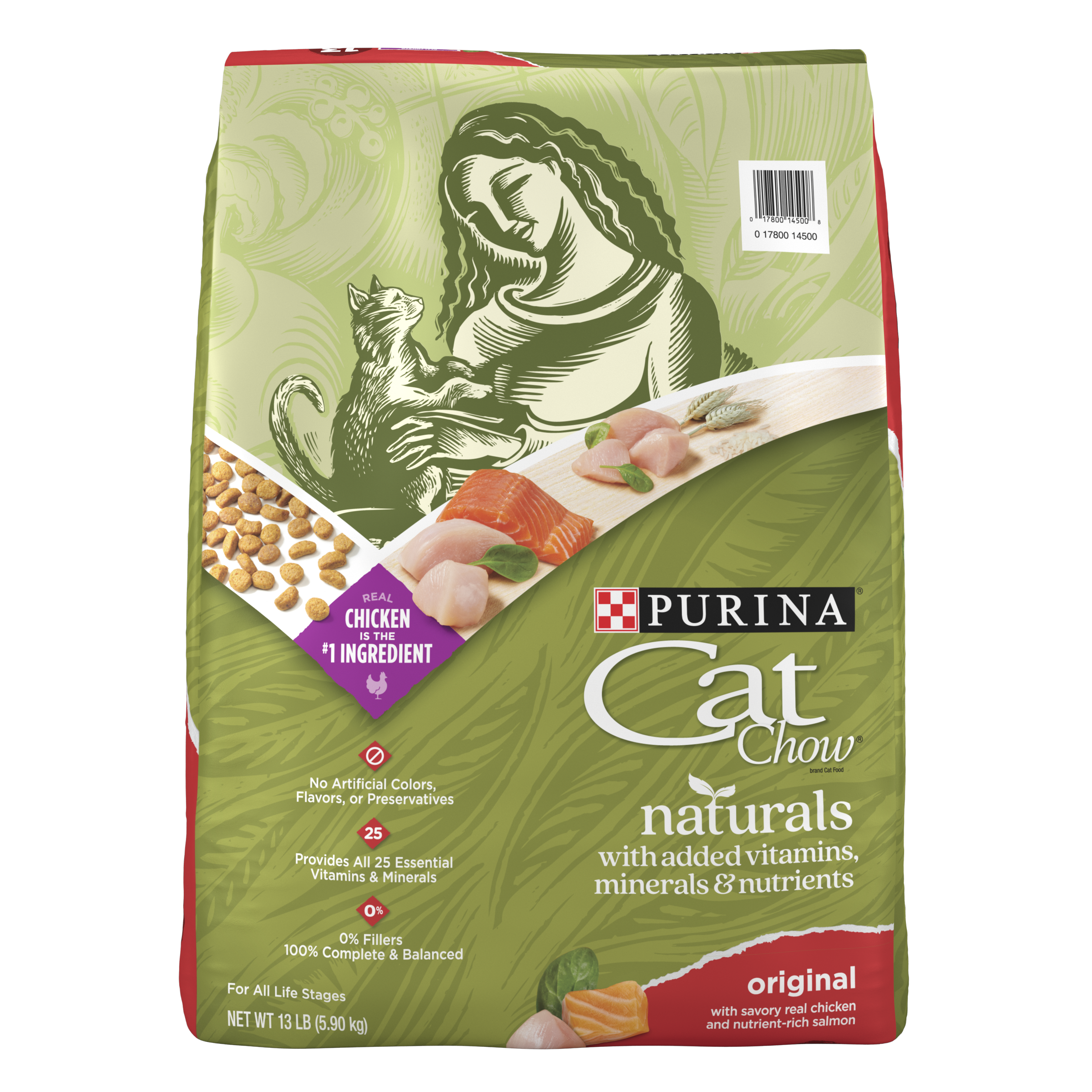 Cat Chow Naturals Original Dry Cat Food leaves out the artificial additives and gives your cat the nutrition he needs, with natural ingredients like real chicken and salmon, whole grains and a touch of leafy greens. High in protein like a cat’s natural diet, it’s a formula your pal find naturally delicious, complete with a fiber blend to help control hairballs. Every meal of Purina Cat Chow Naturals provides complete and balanced nutrition, including essential vitamins and minerals, for all lifestyles and stages.Specifications
