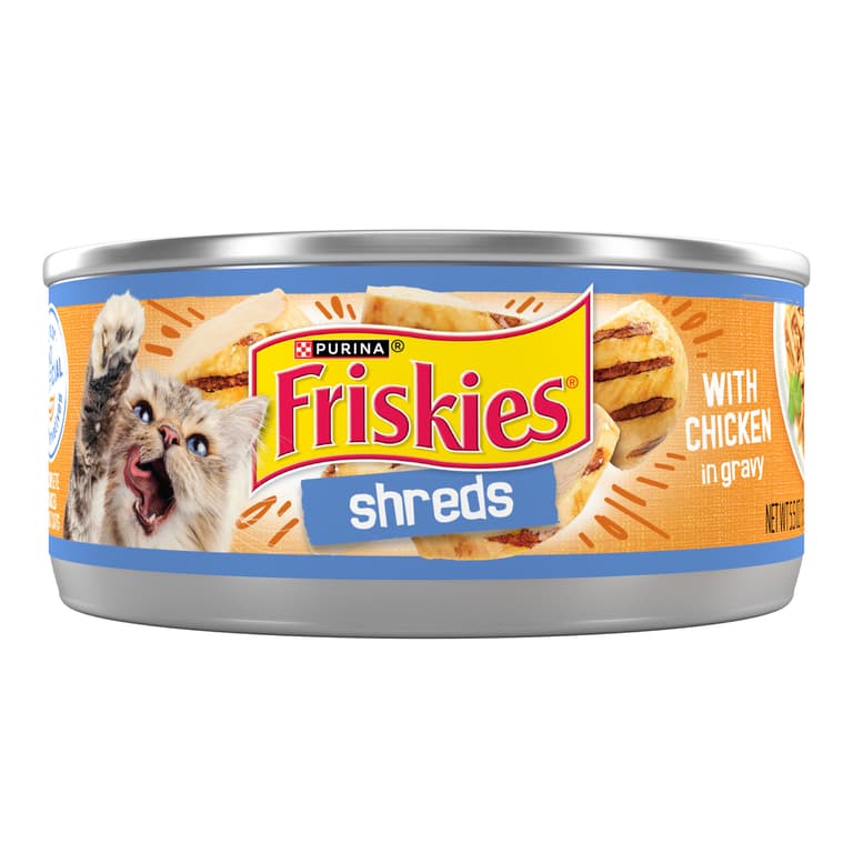 Satisfy your cat's cravings for classic taste with Purina Friskies Shreds With Chicken in Gravy wet cat food. Real chicken delivers the yummy poultry flavor cats love, and the savory gravy adds moisture and flavor for even more delectable goodness in every bite. Featuring a tender shredded texture, this wet cat food invites your cat to nibble to her heart's content. Feel good about giving her 100% complete and balanced nutrition for adult cats, and let her delight in the rich tastes that make this meal an instant favorite for the feline members of your family. Open a can of this tempting recipe, and let the mouthwatering aroma send a signal to your cat that something delicious is about to happen in her dish. With so much decadent flavor packed into every bite, this wet cat food satisfies her cravings and leaves her belly delightfully happy.Specifications