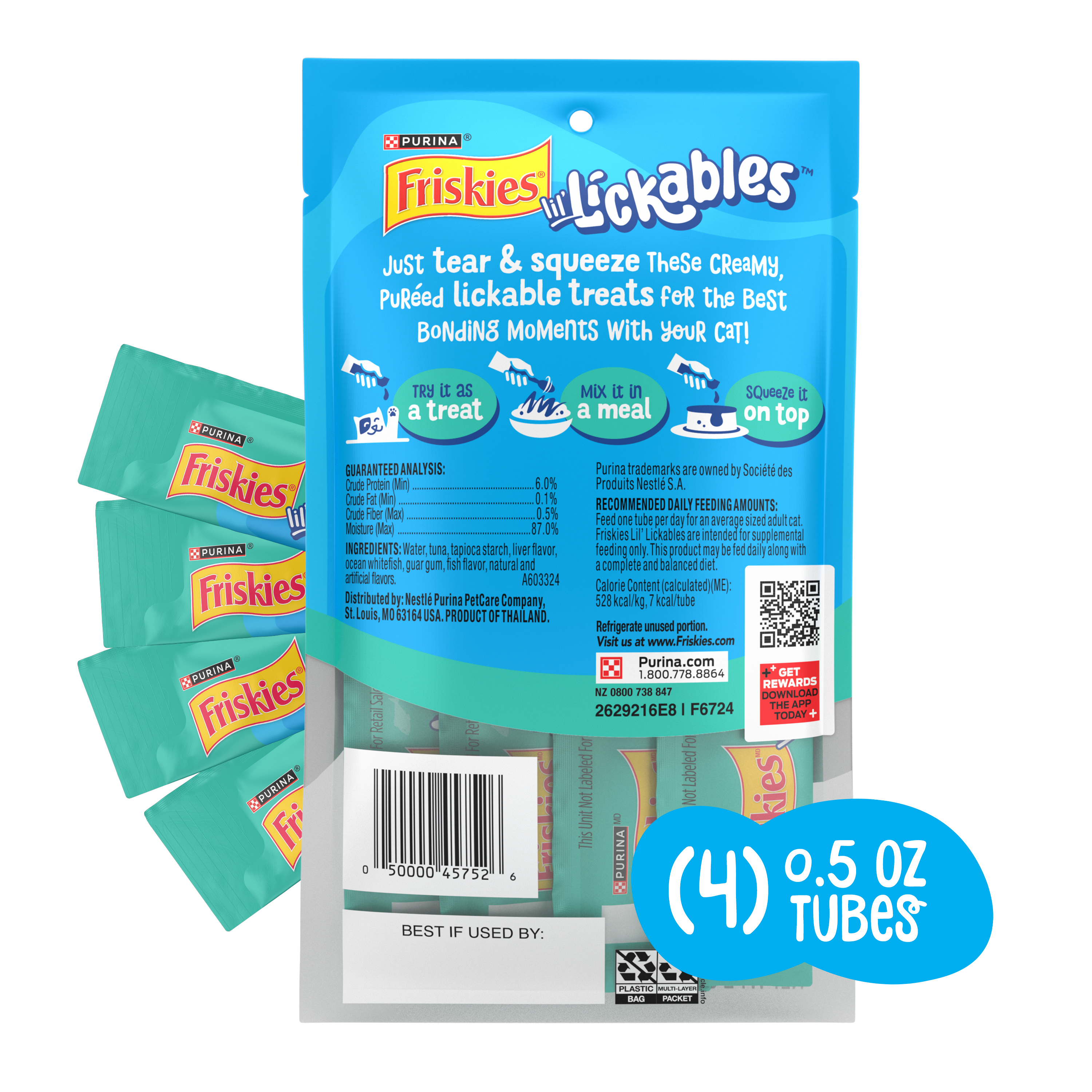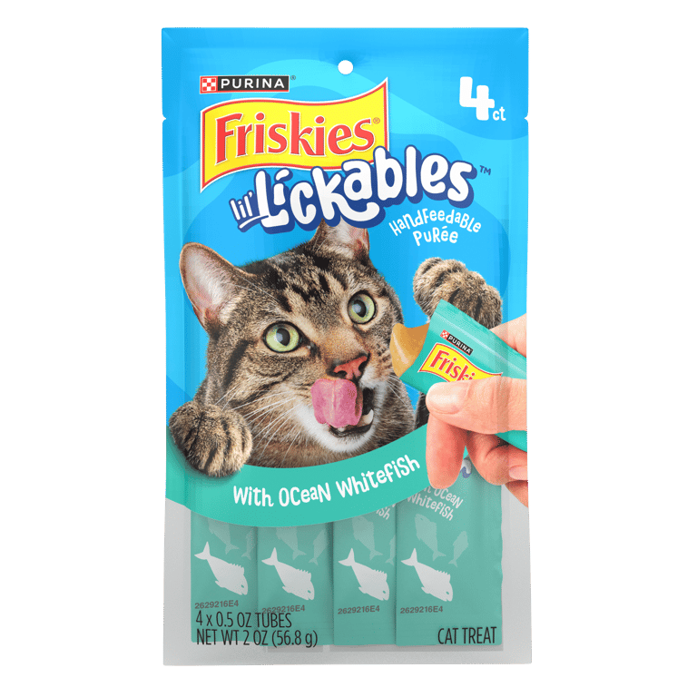 Wow your cat at snack time or mealtime with Purina Friskies lil' Lickables Treats for Cats With Ocean Whitefish. Made for snack time or to be added to her favorite kibble, these soft cat treats are lickable and easy to serve. They have a tasty creamy puree texture and come in convenient hand-held tubes with a tear-open top, simply tear and squeeze and she’ll enjoy the tasty puree, while you enjoy a bonding moment with your favorite feline. Made with real ocean whitefish, each tube measures 0.5 ounces, the perfect size for a delicious snack or to add a little extra flavor to any dry or wet food. Each tube of these wet cat treats helps support healthy hydration to keep her happily purring with satisfaction. Reward your cat with a savory treat, use them to share a moment between mealtimes, or add them to her bowl to support healthy hydration. Check out other flavors including Friskies lil’ Lickables With Chicken or With Tuna to keep your cat’s taste buds delighted and add some variety to snack time.Specifications