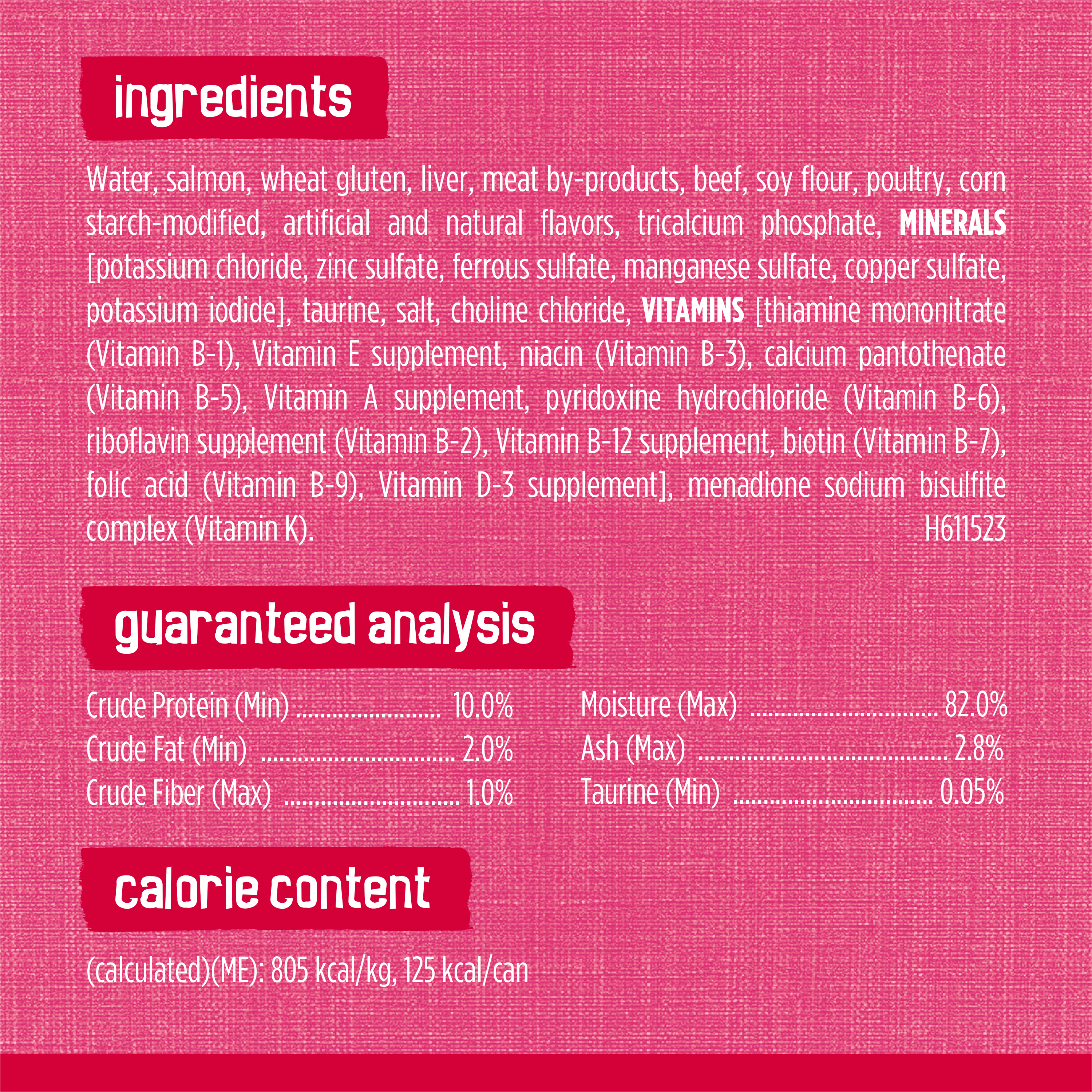 Contains essential vitamins and minerals and the enticing aroma tempts her to her dish; Real salmon and beef adult cat food recipe for the tastes cats love, with savory juices for added flavor and moisture; Shredded, moist cat food chunks offer a tempting texture and 100 percent complete and balanced nutrition for adult cats with no artificial colors or preservatives