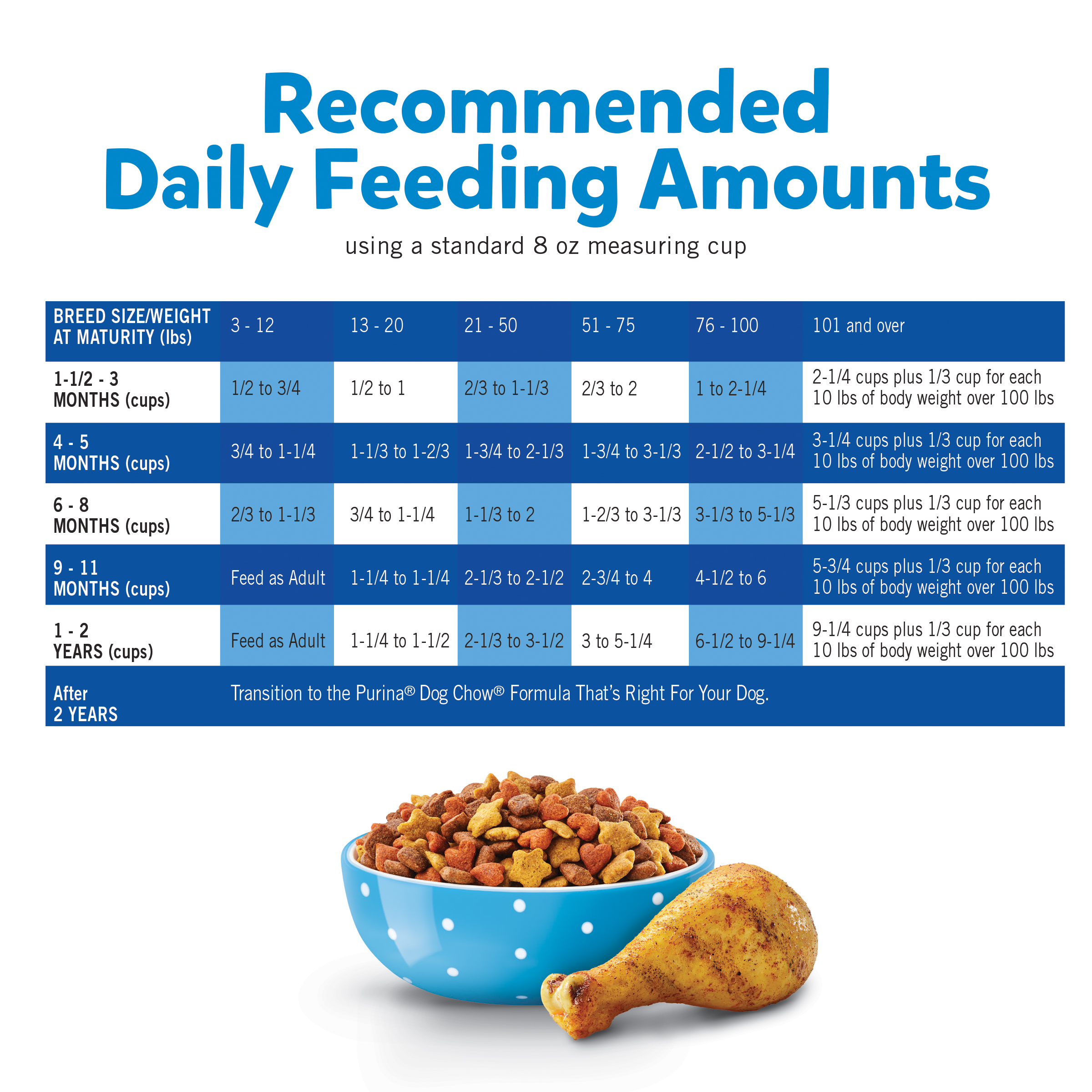 Provide the nutrition your puppy needs to get a great start in life with Purina Puppy Chow Complete With Real Chicken dry puppy food. This high protein dry puppy food contains 100 percent of the essential nutrients puppies require to grow big and strong, and the delicious taste gives him a reason to clean his bowl at every feeding. Tend to your growing pup's nutritional needs through the vital early stages of his development with this dry puppy dog food, and take comfort in knowing he's getting a highly digestible dog kibble formula he's sure to look forward to every day. Packed with 30 percent more protein than the leading adult dog food, this dog food kibble supports your puppy’s growing muscles so he can keep up with his adventurous canine pursuits. So dish up a serving of this Purina Puppy Chow dog food, and let him know you care about his health and happiness. Purina Puppy Chow Complete high protein puppy food provides the Building Blocks of puppy nutrition to help lay the foundation for a healthy, active life. The Healthy Start blend provides high-quality protein, including with real, American-raised chicken, DHA for brain and vision development, antioxidants like vitamin C and 100 percent of the essential nutrients for your puppy’s first year.Specifications