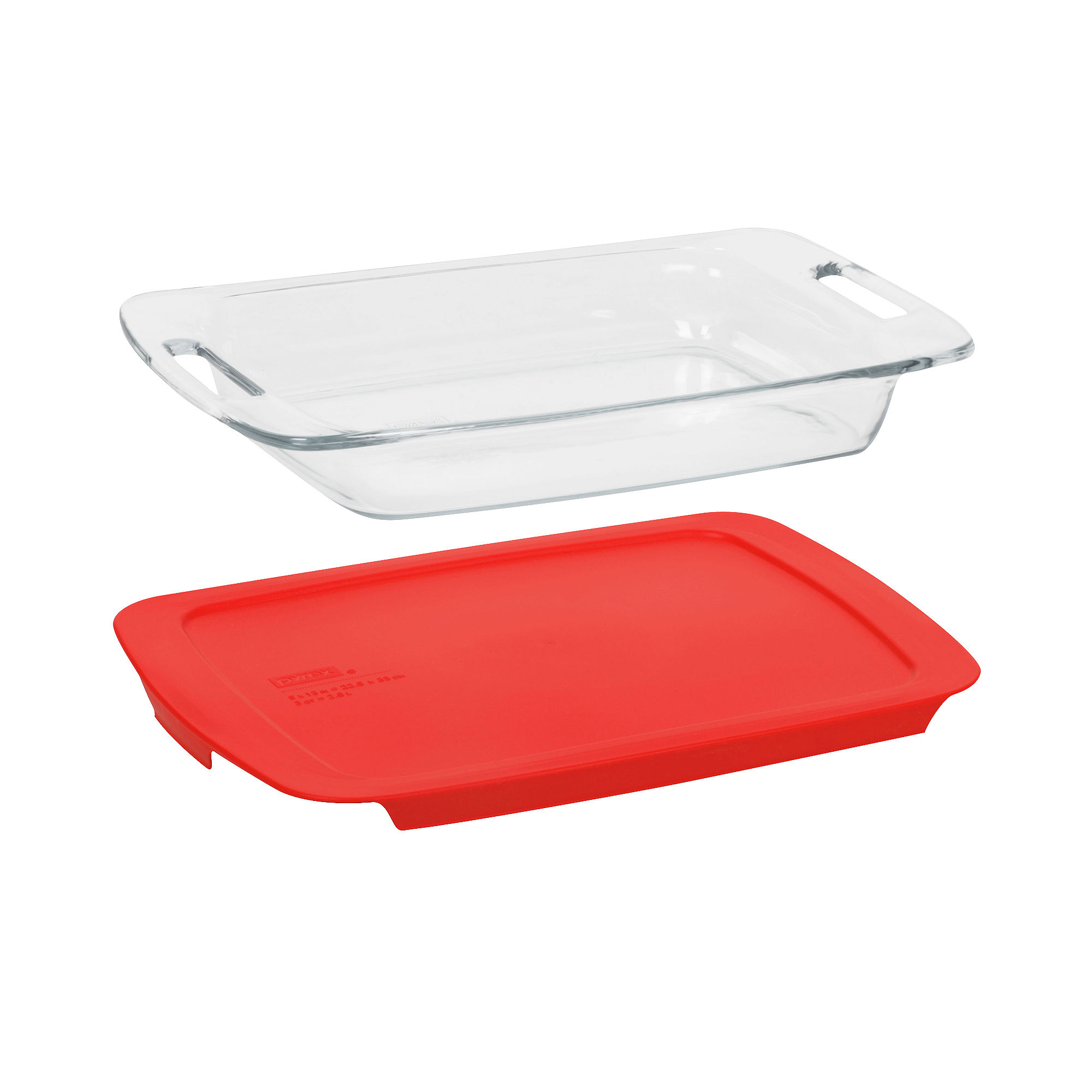 Easy Grab 3-qt Oblong Baking Dish w/Red Lid 9 Inch x 13 Inch; Non-porous surface does not absorb food odors flavors or stains; Plastic lids are BPA free; Plastic lids are top-rack dishwasher safe refrigerator and microwave safe; Pyrex glass is dishwasher refrigerator microwave and pre-heated oven safe; Pyrex glass is proudly made in the USA