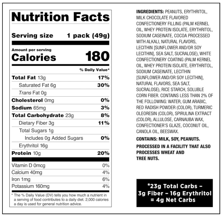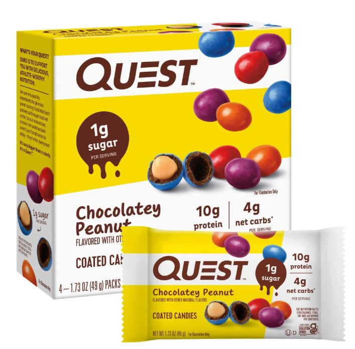 Quest Chocolatey Peanut Coated Candies pack in of 10g of protein with just 1g of sugar per serving. Chocolatey Peanut Coated Candies will crush your candy cravings with a roasted peanut layered in decadent chocolatey coating and encased in a crunchy shell, delivering indulgent flavor and athlete-worthy nutrition in a keto-friendly sweet treat. HACK YOUR SNACK. Quest Peanut Butter Coated Candies are sweet on the outside & peanut butter on the inside with 1g of sugar. AT HOME OR ON-THE-GO. 10g of grab & go protein make them the candy for any time, any place. PROTEIN FORWARD. Quality dairy-based proteins provide the amino acids your body wants. YOUR PB PARADISE. With Quest Coated Candies you can snack without looking back. QUEST. Big on protein, low on sugar, huge on flavor. Yep, it’s basically cheating. Per serving. See Nutrition Facts for Calories and Saturated Fat Contents. 1g Sugar, Including Og added sugars per serving. Not a low-calorie foodSpecifications
