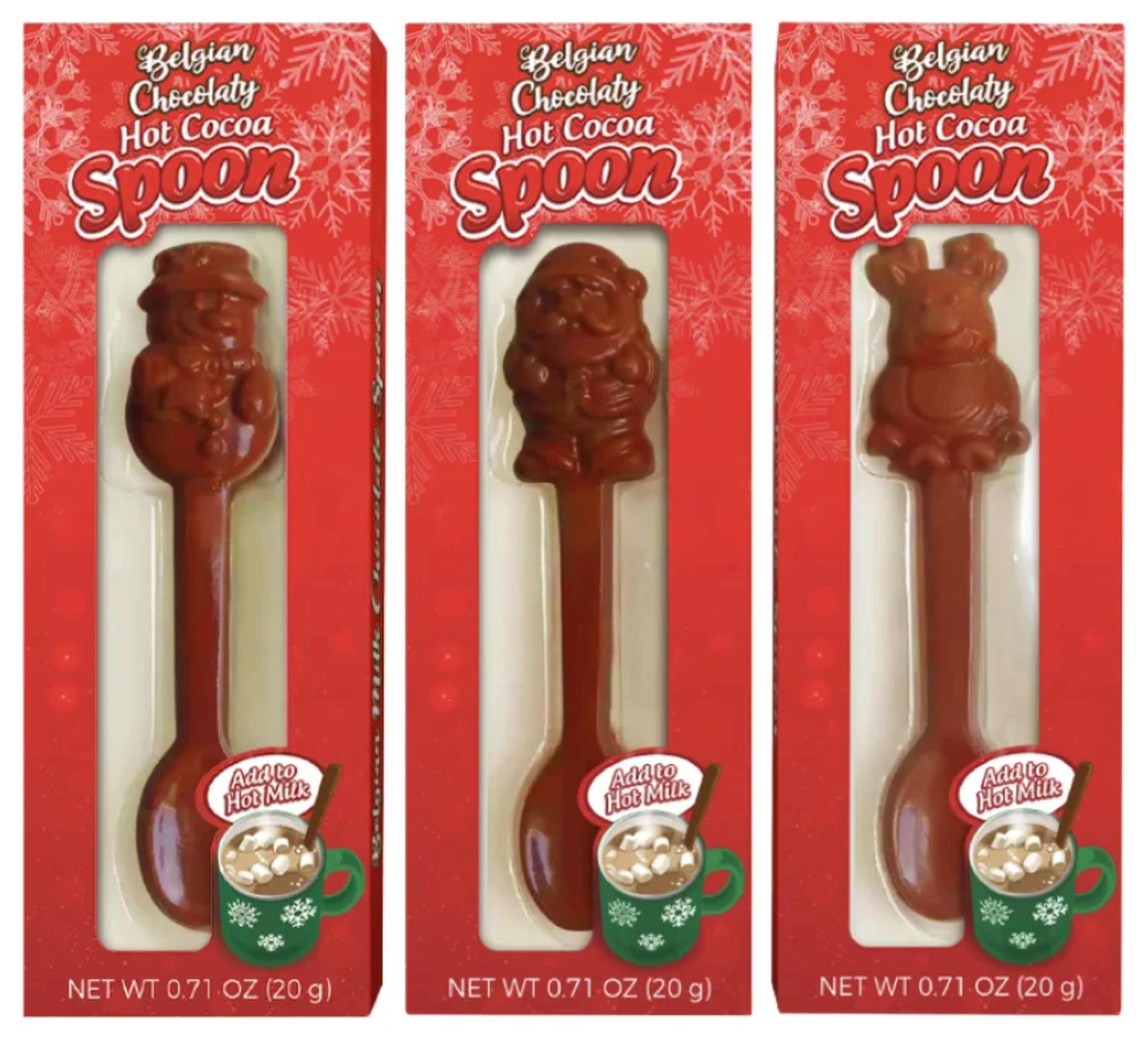 R L ALBERTS CHOCOLATE SPOONS ARE THE PERFECT ADDITION TO YOUR HOT CHOCOLATE THIS SEASON. EACH SPOON FEATURES A SEASONAL DESIGN SUCH AS A REINDEER, A SANTA OR A SNOWMAN. GRAB YOUR FAVORITE AND ENJOY.Specifications