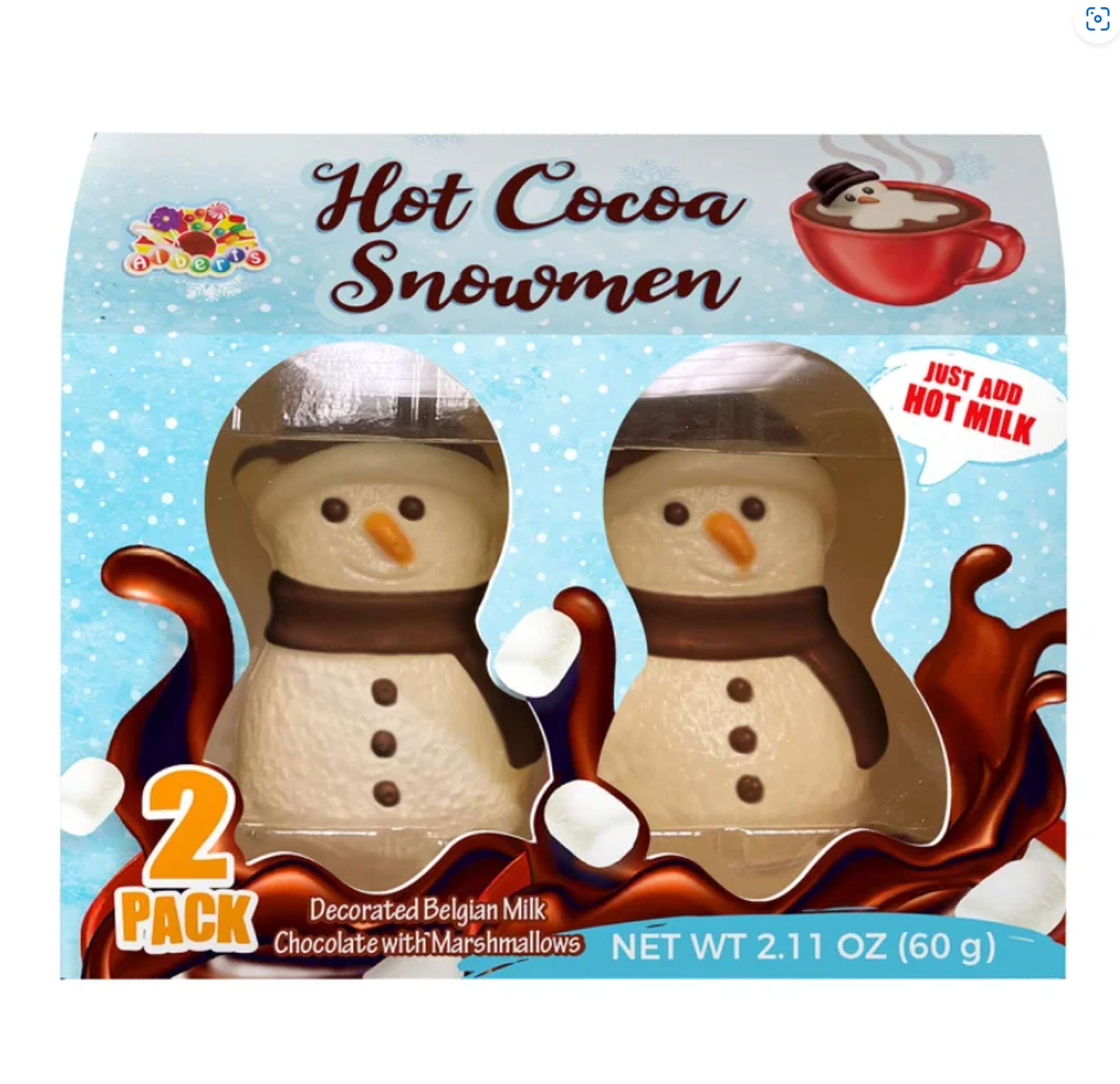 R L ALBERTS HOT COCOA SNOWMAN MELTS ARE A FESTIVE ADDITION AT ANY HOLIDAY CELEBRATION. THIS 2 PACK OF SNOWMEN ARE COVERED WITH A BELGIAN MILK CHOCOLATE SHELL AND FILLED WITH HOT CHOCOLATE AND MARSHMALLOWS. SIMPLY WARM UP 1 CUP OF MILK OR YOUR FAVORITE NON DAIRY BEVERAGE, CAREFULLY ADD THE SNOWMAN AND ALLOW TO MELT. ONCE MELTED STIR UNTIL COMPLETELY DISSOLVED AND ENJOYSpecifications