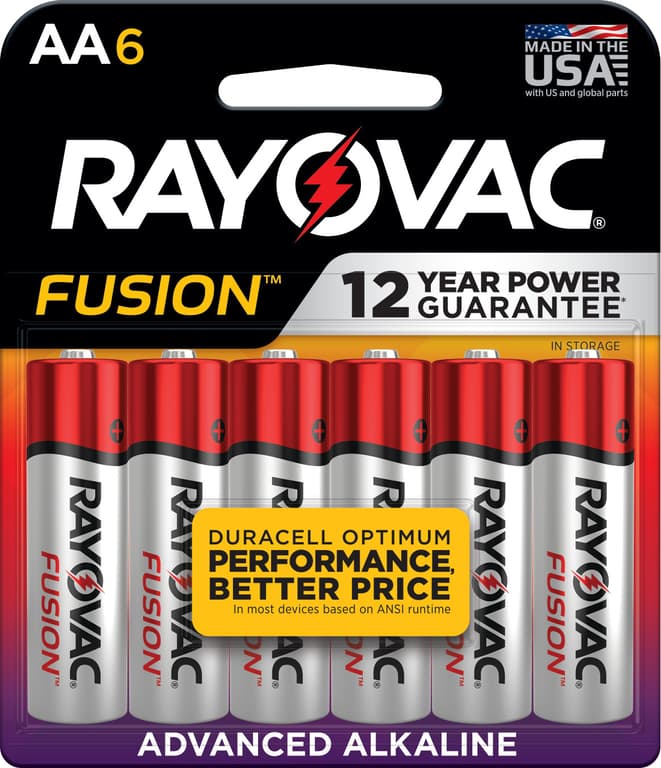 Designed to Prevent Damaging Battery Leaks & Tested Twice Prior to Shipment; Excels in High-Powered AA Battery Devices: High-Tech Toys, Video Game Controllers, Wireless Headsets & More; Made in the USA with U.S. & Global Parts; No AA Alkaline Battery Lasts Longer on ANSI Average Performance Tests; Proudly Produced in Fennimore, WIRayovac Fusion AA Batteries Hold Power Up to 12 Years in Storage
