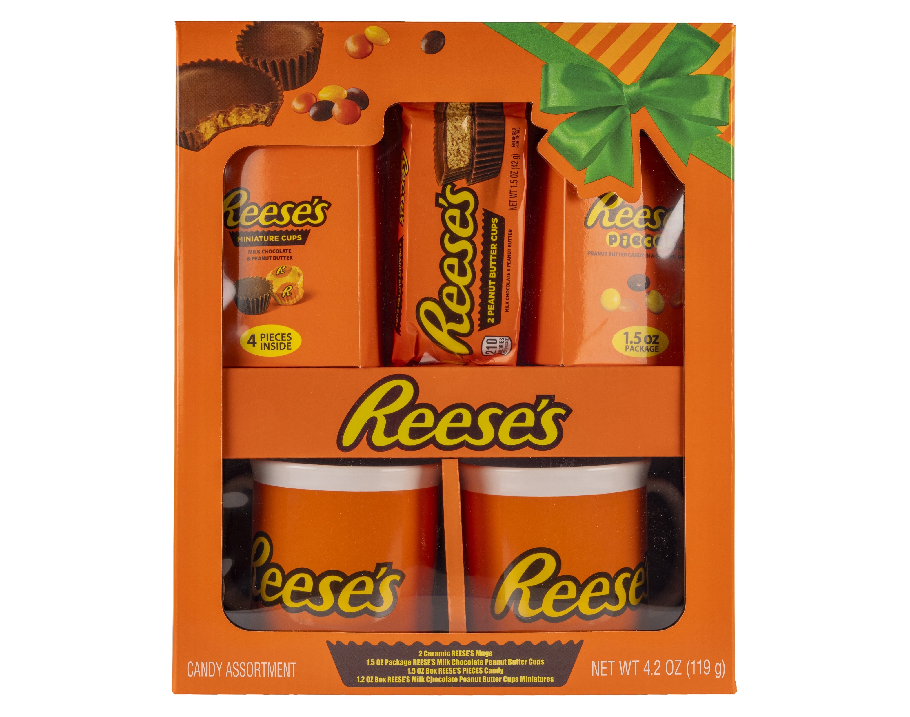 INSIDE THIS FESTIVE GIFT BOX, YOU'LL DISCOVER AN ASSORTMENT OF REESE'S CANDIES, INCLUDING THE CLASSIC REESE'S PEANUT BUTTER CUPS, REESE'S PIECES, AND REESE'S MINIATURES. ACCOMPANYING THE DELICIOUS TREATS ARE TWO HIGH QUALITY CERAMIC MUGS EMBLAZONED WITH THE ICONIC REESE'S LOGO.Specifications