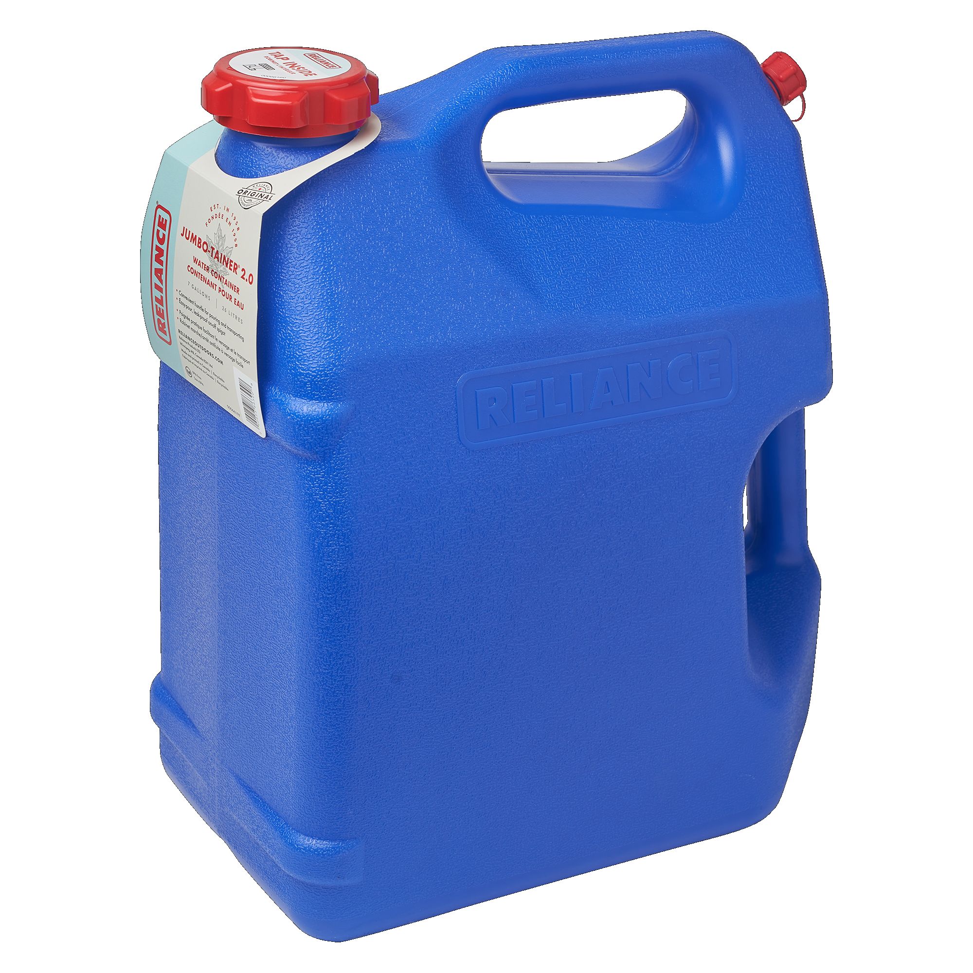 Combines the easy to carry shape of a traditional jerry can in a more contemporary design. Features reliable tap style spigot and dual grip-through handles for easy lifting and pouring. Reliance Jumbo-Tainer 7 gal Container 8930-03.Specifications