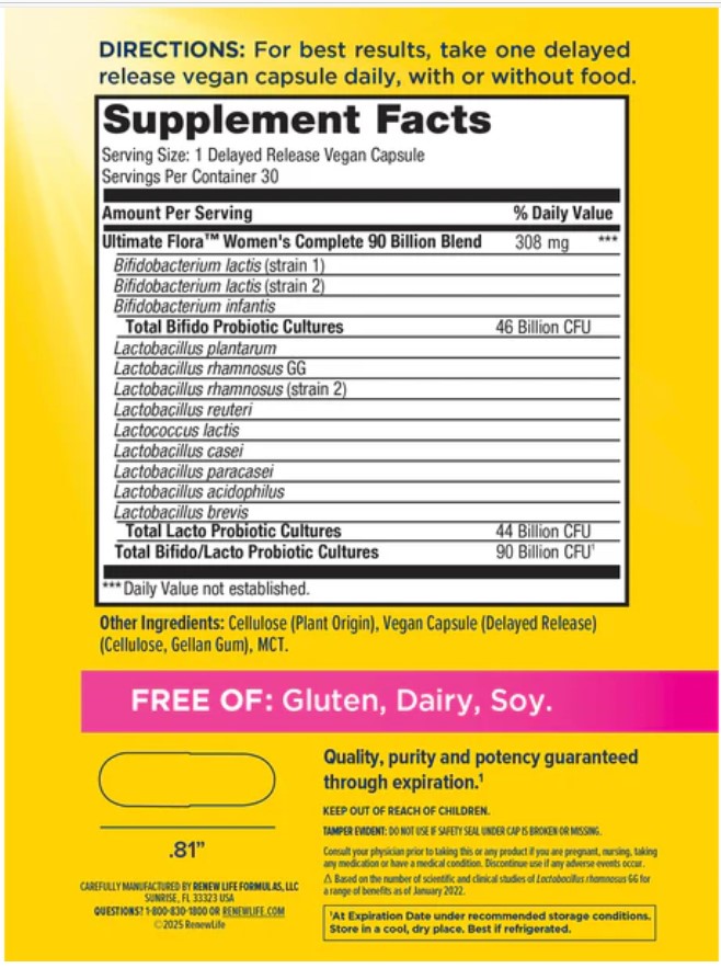 Renew Life Ultimate Flora Women’s Care Probiotic has 25 billion live cultures from 12 probiotic strains to support urinary, digestive and immune health, and healthy vaginal pH and yeast levels. It has more strains with clinical trials on women than the strain in the leading brand, and has strains backed by 25 years of women’s clinical research.WOMEN'S PROBIOTIC: Includes one 60-count bottle of Renew Life Women's Care Probiotic Capsules 25 Billion CFU for vaginal, urinary, digestive and immune support (1)CLINICALLY TESTED STRAINS: Women's health probiotic supplement with a blend of 12 different strains to support vaginal, urinary, immune and digestive healthDIVERSE FORMULA: Daily probiotic pills with more clinically studied strains than the leading brand (2) to provide science-backed benefits12 DIVERSE STRAINS: Renew Life womens probiotic contains 12 diverse strains, including the No. 1 most studied strain, the L. rhamnosus GG - for gut health and healthy immune response (3)MULTIPLE BENEFITS: Womens health probiotic helps maintain healthy vaginal bacteria and yeast levels, and supports digestive, urinary and immune healthTESTED AND FORMULATED: Includes 25 billion cultures and world-class strains that are clinically tested and formulated by microbiologists and researchersTOP-QUALITY: These easy-to-swallow, delayed-release pills help ensure the probiotics reach your gut alive and guarantee potency, quality and purity through the expiration date(1) These statements have not been evaluated by the Food and Drug Administration. This product is not intended to diagnose, treat, cure or prevent any disease. (2) Based on IRI unit sales data, January 2021. (3) L. rhamnosus GG strain, PubMed Clinical Trials, August 2019.Specifications