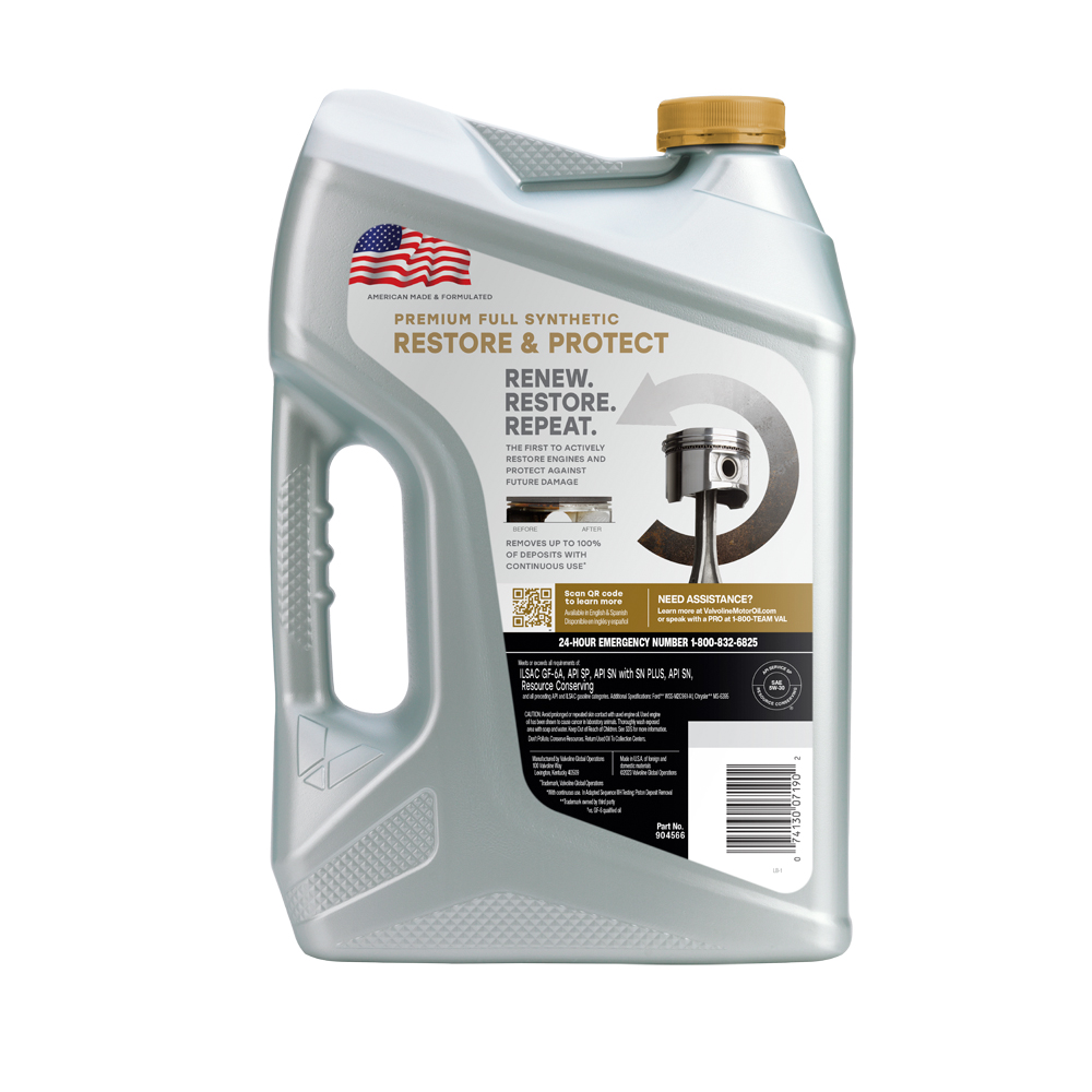 Restore & Protect Premium Full Synthetic is the biggest breakthrough in motor oil since Valvoline introduced it 150 years ago. With continuous use, Valvoline’s proprietary Active Clean technology removes up to 100% of deposits, while its exclusive Liqui-Shield technology works to prevent future deposit formation. A clean engine minimizes friction between metal surfaces, helping to improve fuel economy. Valvoline Restore & Protect is the best motor oil for any age vehicle, from a new car’s first oil change to high-mileage vehicles. There’s no other motor oil like it. Valvoline Restore and Protect Premium Full Synthetic helps maximize fuel economy, horsepower, and engine life. We made it first, so you can keep your pistons factory clean. Renew. Restore. Repeat. (with regular oil changes. In Adapted Sequence IIIH Testing: Piston Deposit Removal) The best motor oil for any age vehicle, from your new car’s first oil change to high-mileage vehicles.Specifications